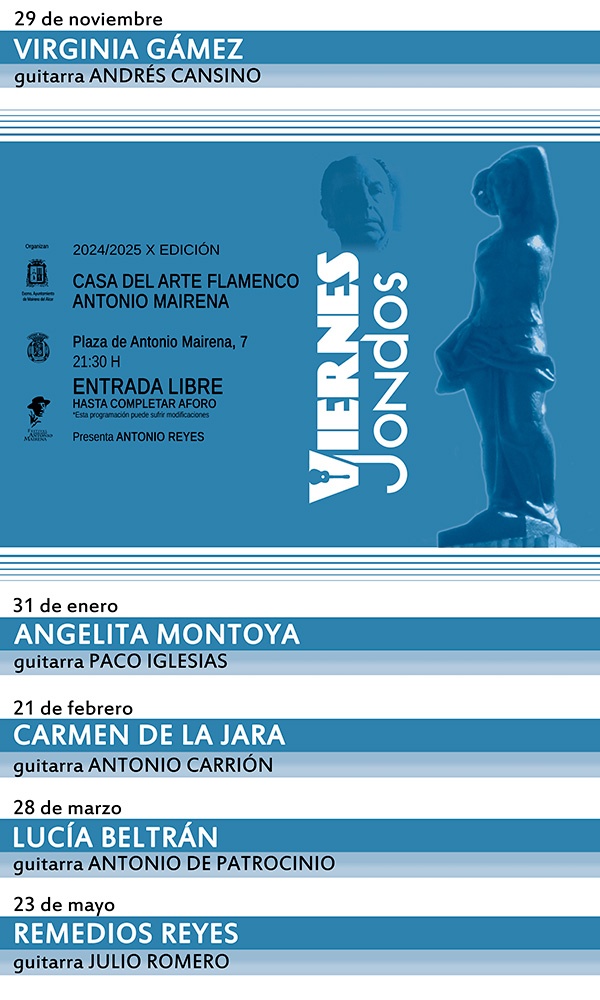 Comenzará el 29 de noviembre con la actuación de Virginia Gámez a la guitarra de Andrés Cansino. Ya en 2025, el 31 de enero estará al cante Angelita Montoya a la guitarra de Paco Iglesias, el 21 de febrero Carmen de la Jara a la guitarra de Antonio Carrión, el 28 de marzo Lucía Beltrán a la guitarra de Antonio de Patrocinio y el 23 de mayo Remedios Reyes a la guitarra de Julio Romero. Presenta Antonio Reyes.