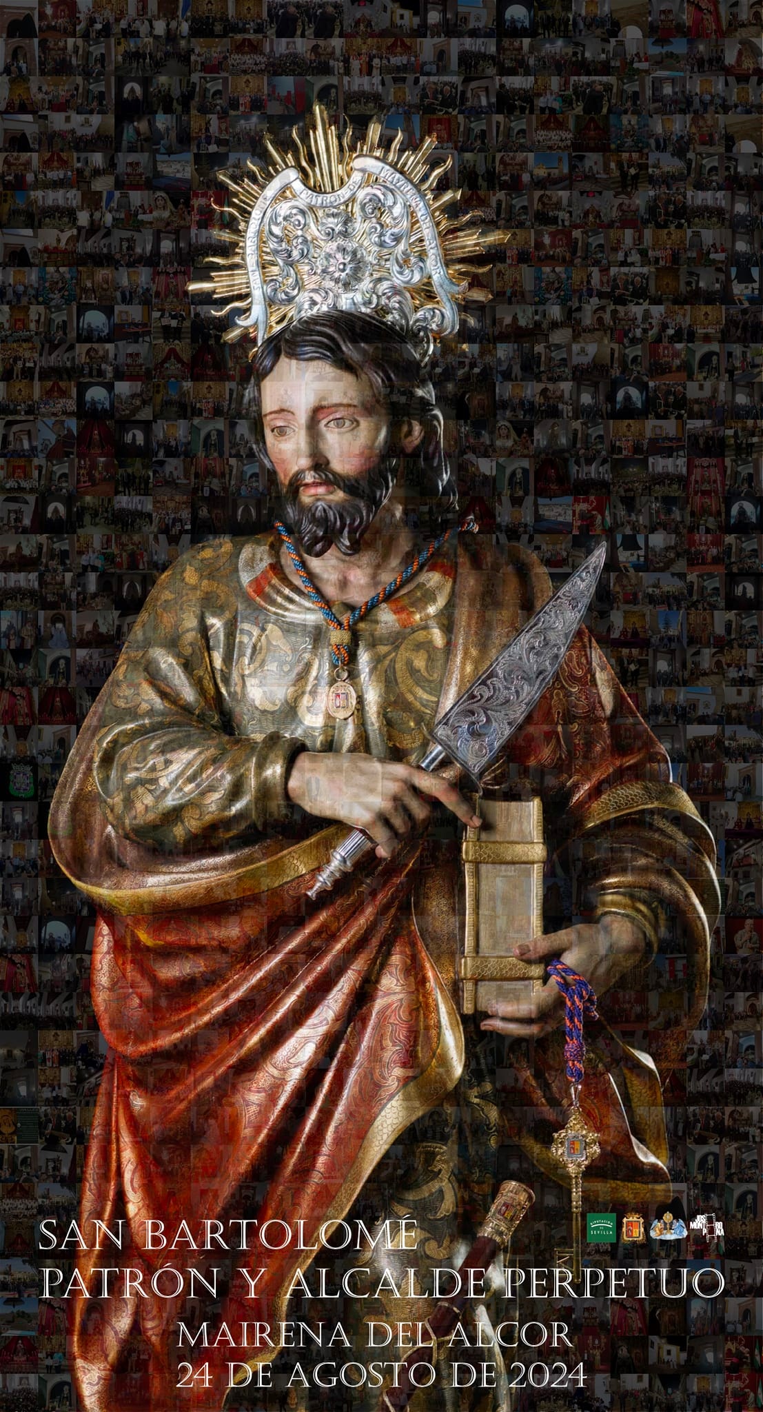 Mairena del Alcor queda bajo el patronazgo de San Bartolomé a partir de 1247, al coincidir la conquista de la villa por Fernando III 'El Santo' con la festividad del apóstol. Es Alcalde Perpetuo desde 1997, año en el que también le fue impuesta la Medalla de Oro por el 750 aniversario del patronazgo. Sebastián Santos Rojas es el autor de la imagen, tallada en madera de cedro desde septiembre de 1944 a febrero de 1946, encargada por el Ayuntamiento como regalo a su pueblo.