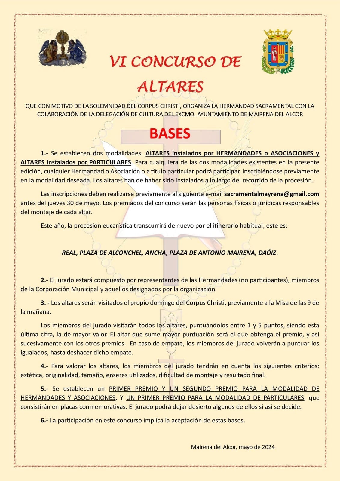 La Archicofradía Sacramental de Mairena del Alcor, con la colaboración de la Delegación de Cultura, convoca el VI Concurso de Altares con motivo de la festividad del Corpus Christi 2024