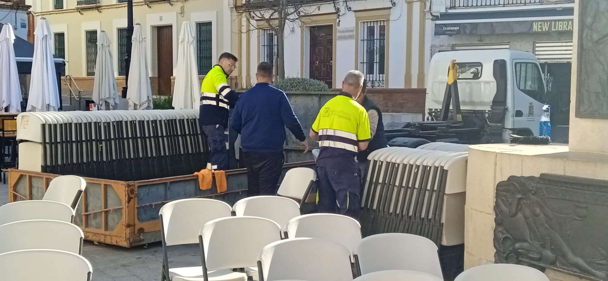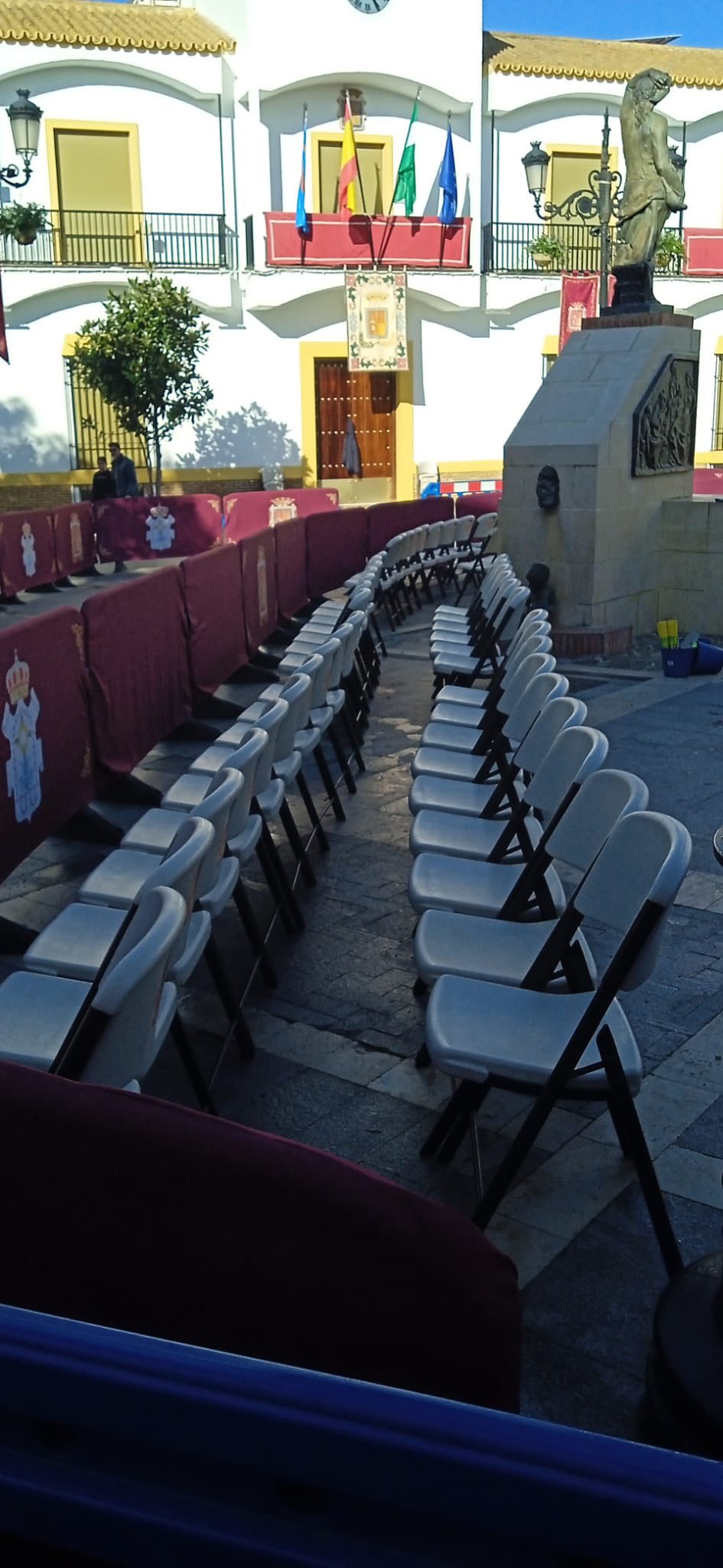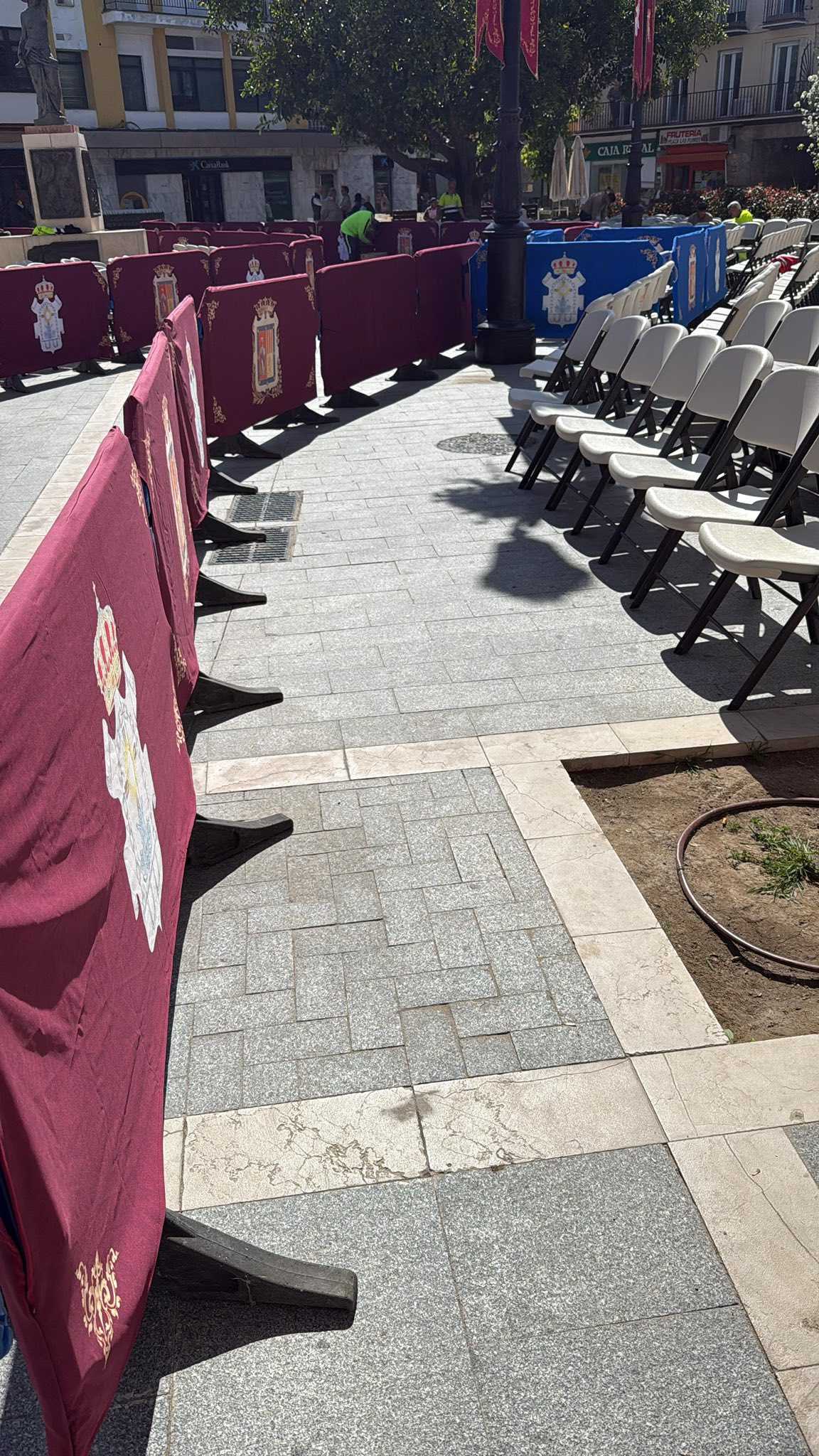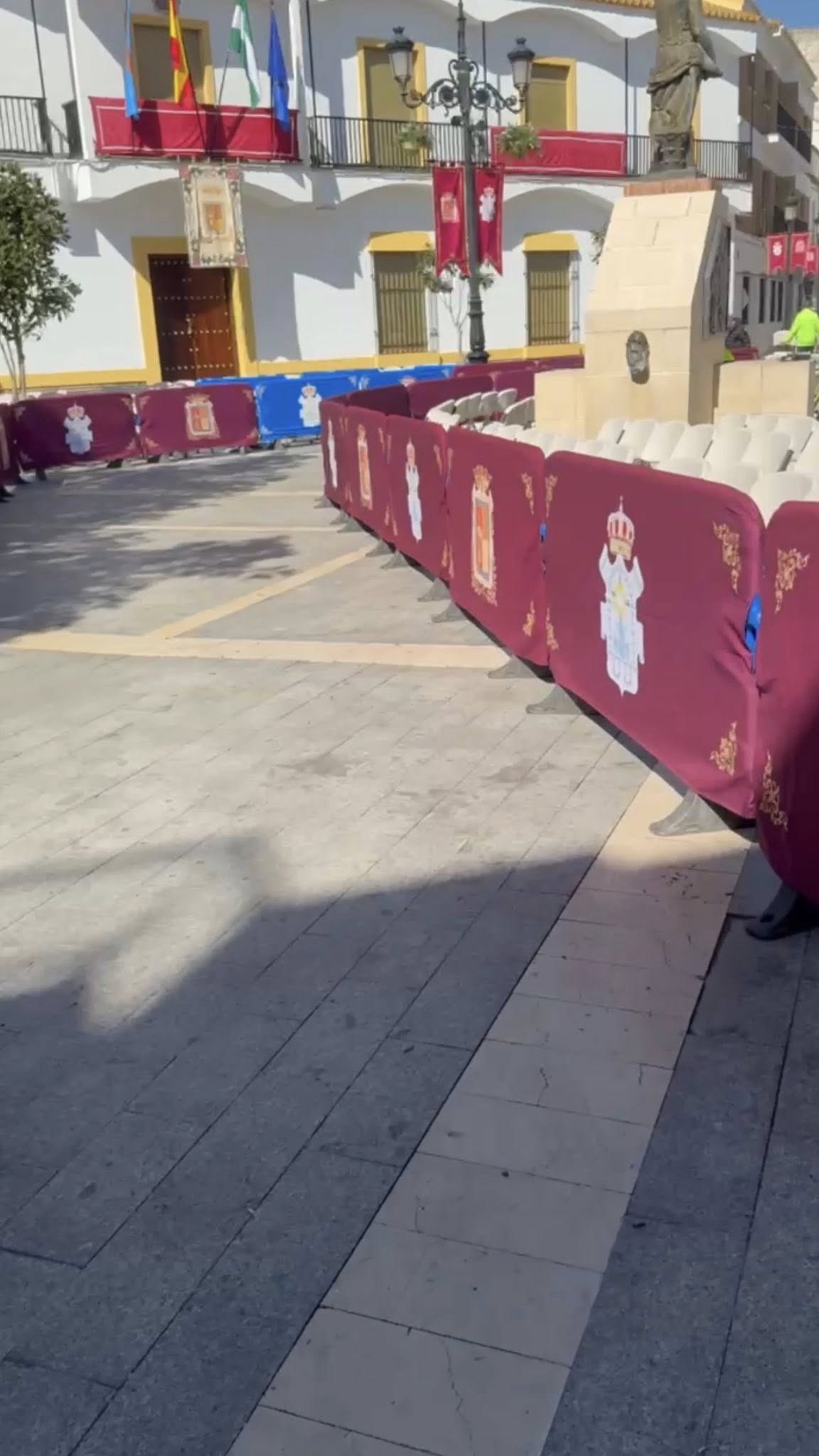 El concejal de Servicios, José Romero, la concejal de Festejos, Inmaculada Galocha, el presidente del Consejo de Hermandades y Cofradías, José Manuel Jiménez, y los operarios municipales han estado en el montaje de la carrera oficial donde se han colocado cerca de medio millar de sillas, más que otros años, totalmente gratuitas, y de manera preferente para personas mayores, mujeres embarazadas y personas con movilidad reducida.