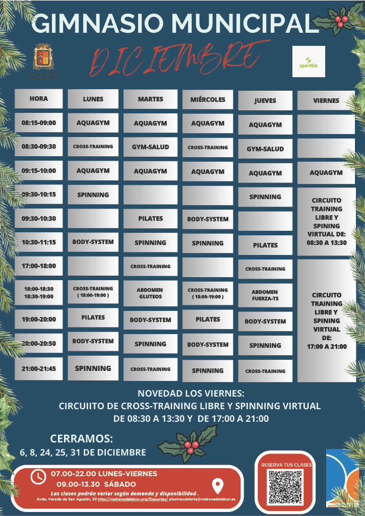 La Delegación de Deportes difunde las actividades y horarios del gimnasio municipal para el mes de diciembre.