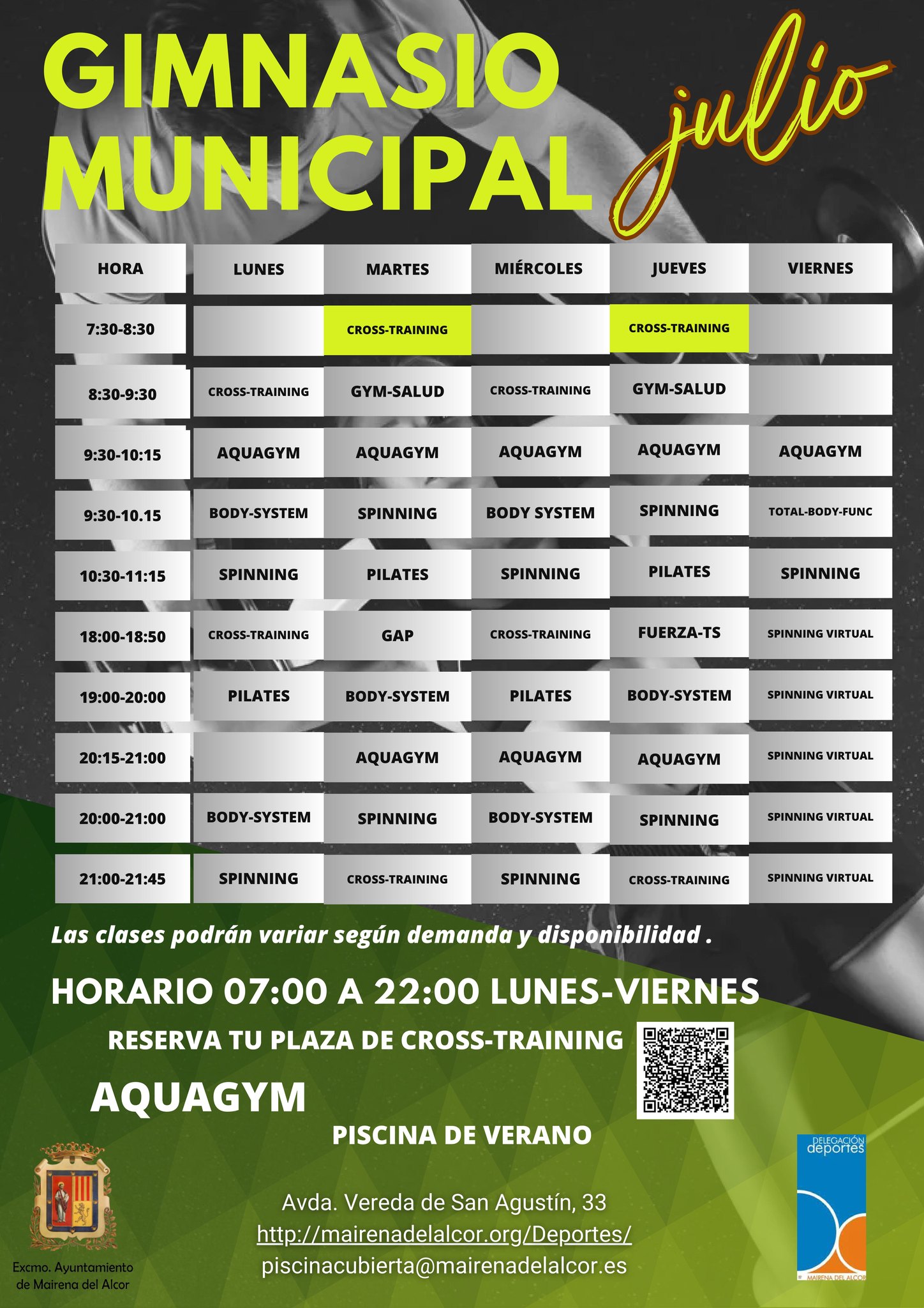 La Delegación de Deportes difunde las clases y horarios del gimnasio municipal para el mes de julio de 2025.
