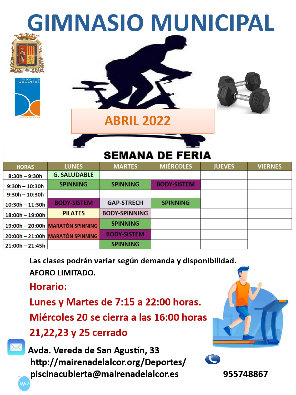 Piscina y Gimnasio Teléfono 95 574 88 67   email piscinacubierta@mairenadelalcor.es