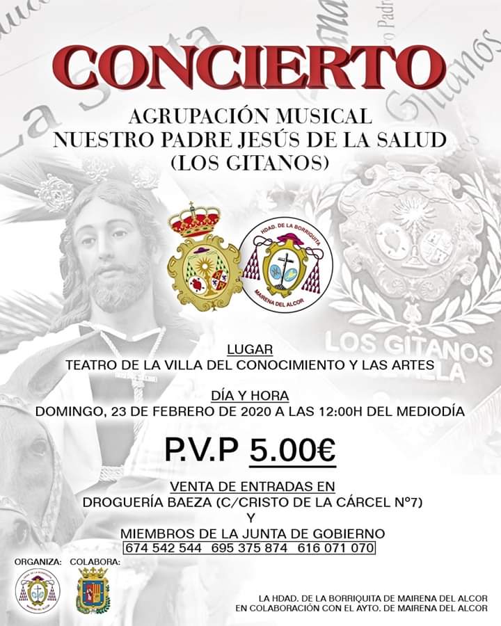La Hermandad de la Borriquita organiza un concierto cofrade en colaboración del Ayuntamiento de Mairena del Alcor, el domingo 23 de febrero a las 12.00 horas en el Teatro de la Villa del Conocimiento y las Artes.