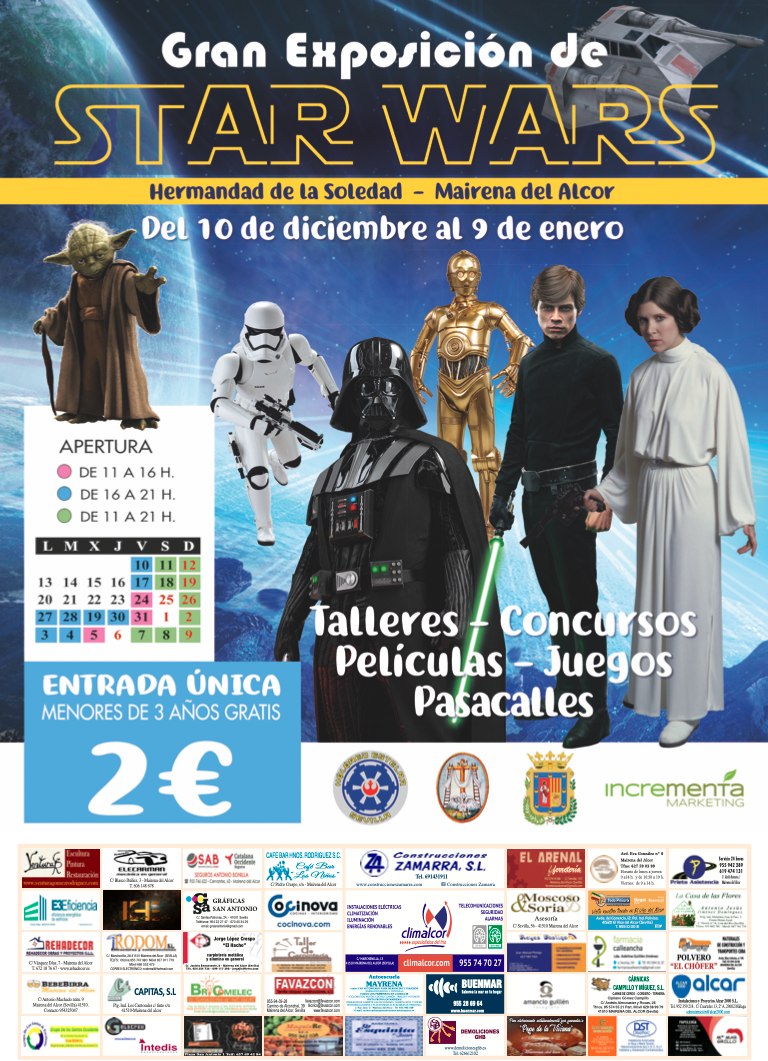 La Delegación de Cultura informa que la Hermandad de La Soledad organiza desde el 10 de diciembre hasta el 9 de enero de 2022, una Gran Exposición de Star Wars, en su Casa Hermandad (calle Trianilla, 30). El horario de apertura está indicado en el calendario incluido en el cartel.