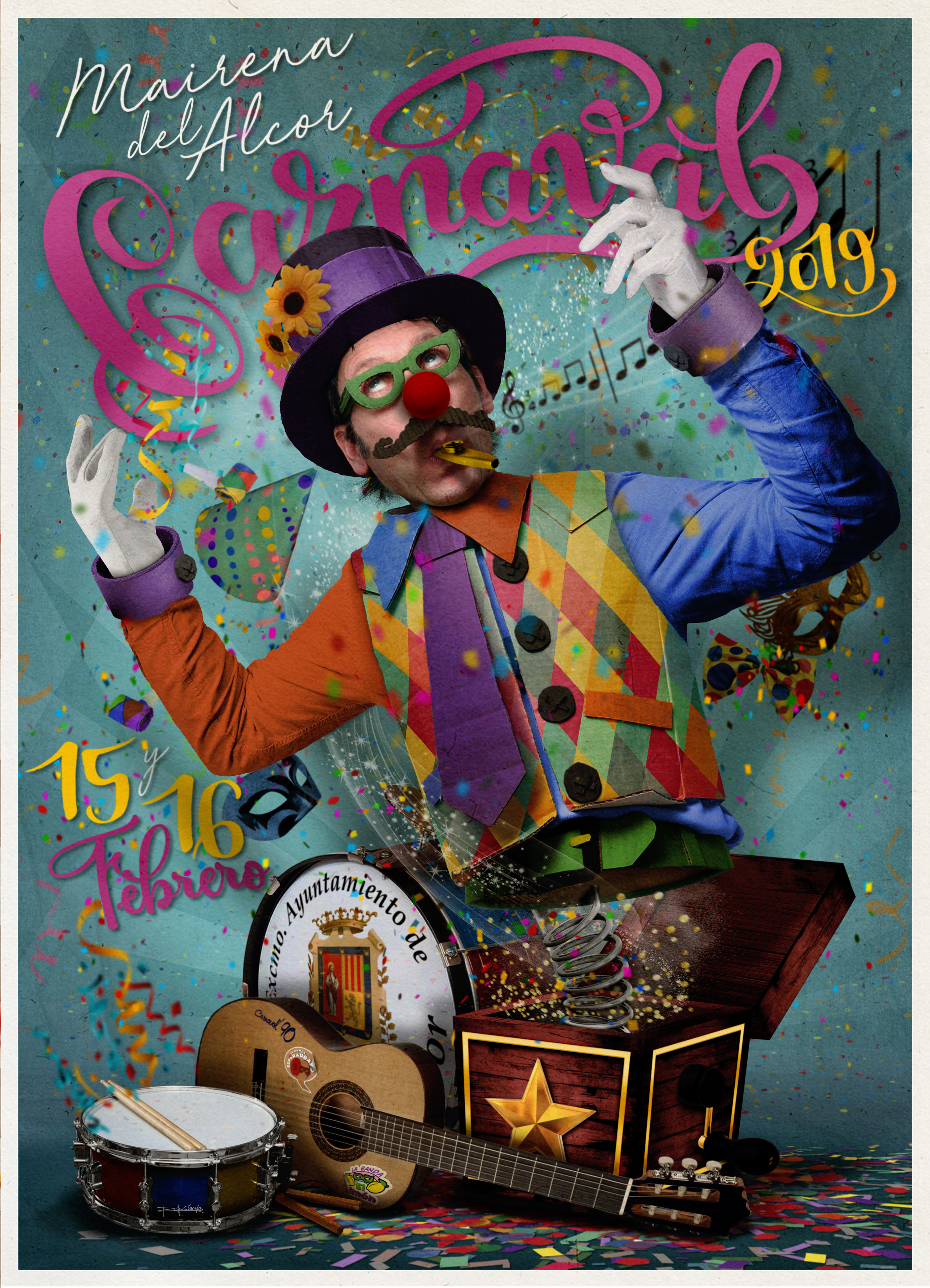 En Papel, cartón, música y color -título del cartel- “he intentado reflejar el colorido, la alegría y la importancia del disfraz o tipo, así como de la música, o 3x4 dicho en lenguaje carnavalesco. Haciéndole un guiño a aquellas agrupaciones maireneras de los 90's como 'La banda del esparadrapo' y la 'Banda el limón' que marcaron los primeros pasos de las agrupaciones en la localidad” ha explicado Alcaide.