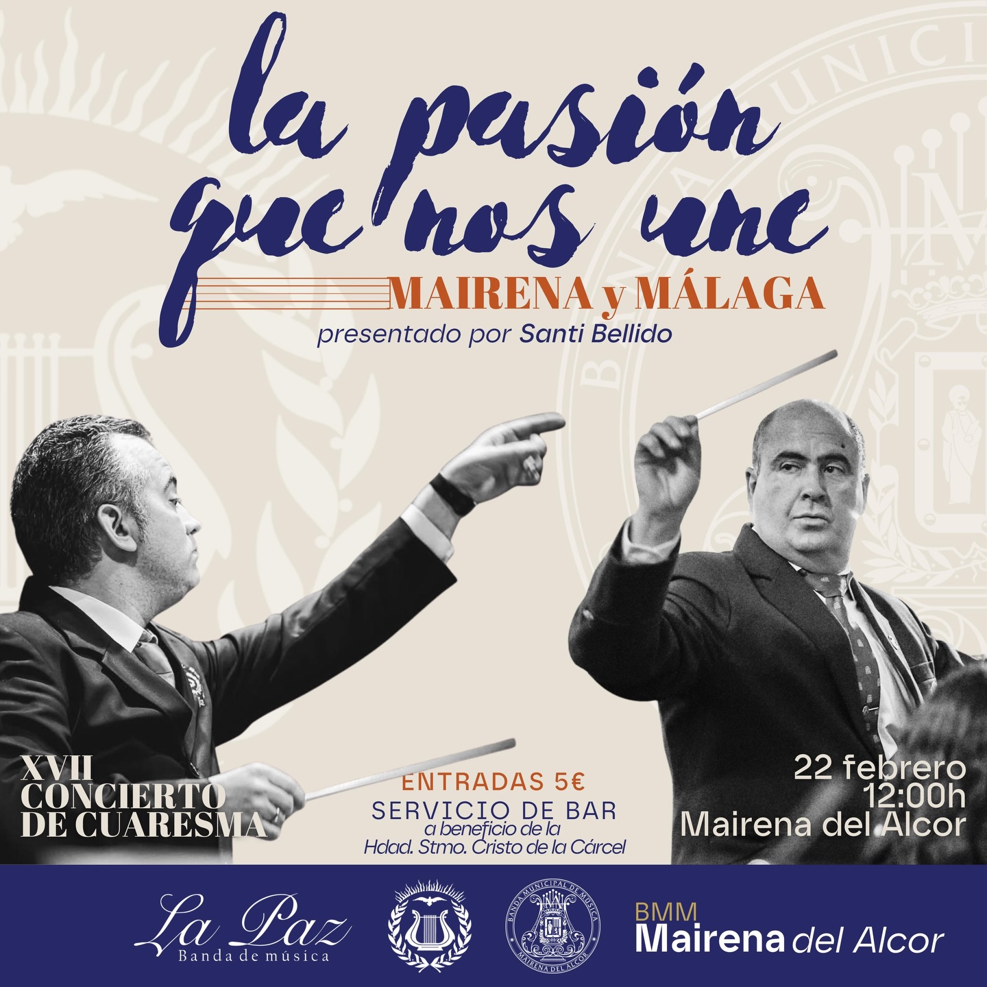 La Banda Municipal de Música de Mairena del Alcor compartirá escenario con la Banda la Paz de Málaga. Será el domingo 22 de febrero a las 12:00 horas en la Casa Palacio.