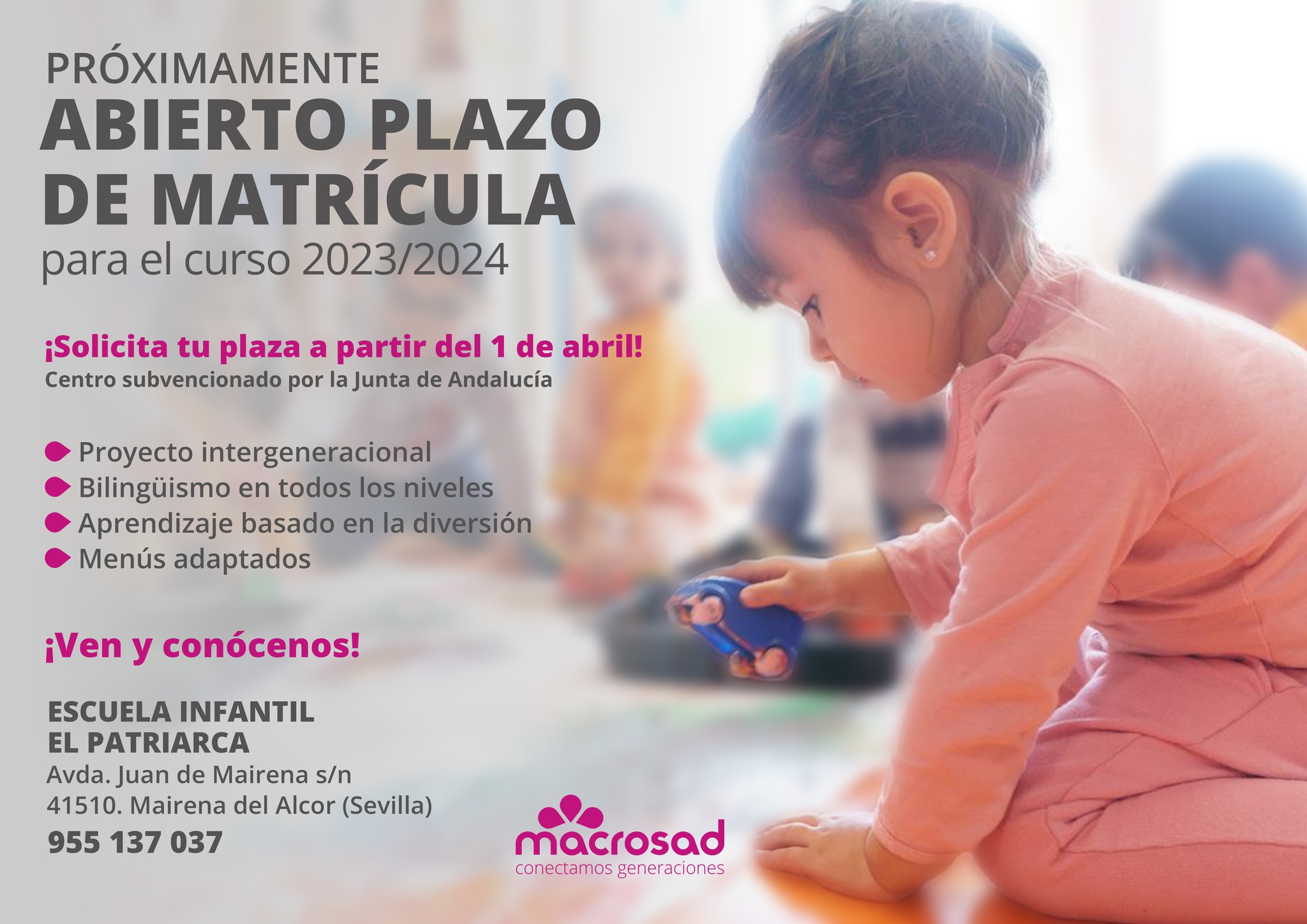 La Delegación de Educación difunde el plazo de presentación de solicitudes en las escuelas públicas de educación Infantil para el curso 2023/2024. Este procedimiento ordinario de admisión será del 1 de abril al 2 de mayo, para todos los niños y niñas con edades comprendidas entre las 16 semanas y los 3 años de edad que accedan por primera vez a un centro educativo.