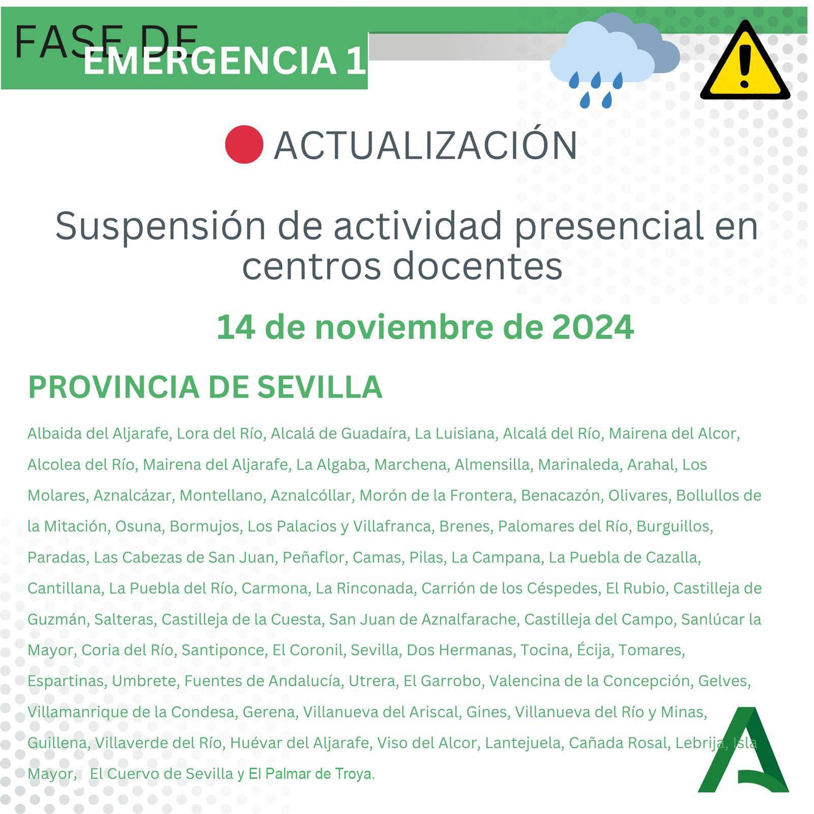 Tras la confirmación oficial recibida por parte de la Consejería de Educación quedan suspendidas las clases de manera presencial en los colegios, centros infantiles e institutos de Mairena del Alcor con motivo de la alerta naranja que se prevé para el día de mañana desde las 00 horas hasta las 18 horas.