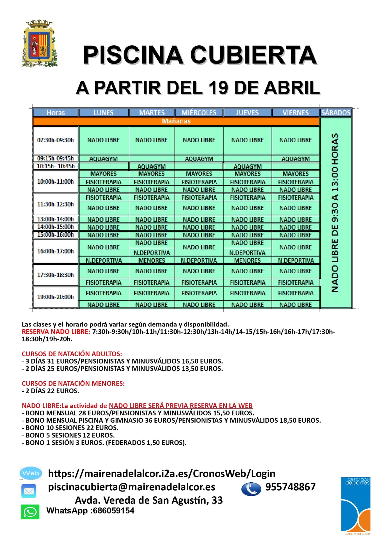 NUEVOS HORARIOS EN GIMNASIO Y PISCINA MUNICIPAL A PARTIR DEL 19 DE ABRIL