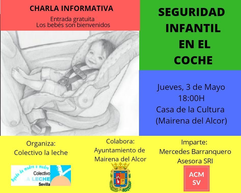 El Colectivo la Leche organiza la charla informativa Seguridad Infantil en el Coche en colaboración con el Ayuntamiento de Mairena del Alcor. Será el jueves 3 de mayo a las 18.00 horas en la Villa del Conocimiento y las Artes, impartida por Mercedes Barranquero que es asesora SRI especializada en el modelo sueco de seguridad y miembro de A contramarcha Salva vidas. La entrada es gratuita. Los bebés son bienvenidos.