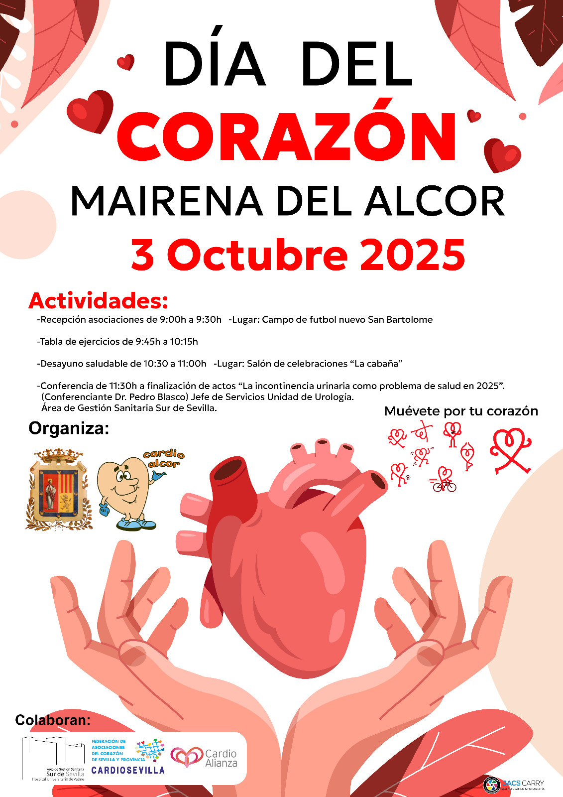 El 2 de octubre de 9 a 11 horas tendrá lugar una jornada de tomas de tensión en la plaza Antonio Mairena. Para celebrar el Día Mundial del Corazón, el día 3 de octubre se darán cita varias asociaciones cardíacas de la provincia para participar en una tabla de ejercicios físicos, desayuno cardiosaludable y conferencia médica.
