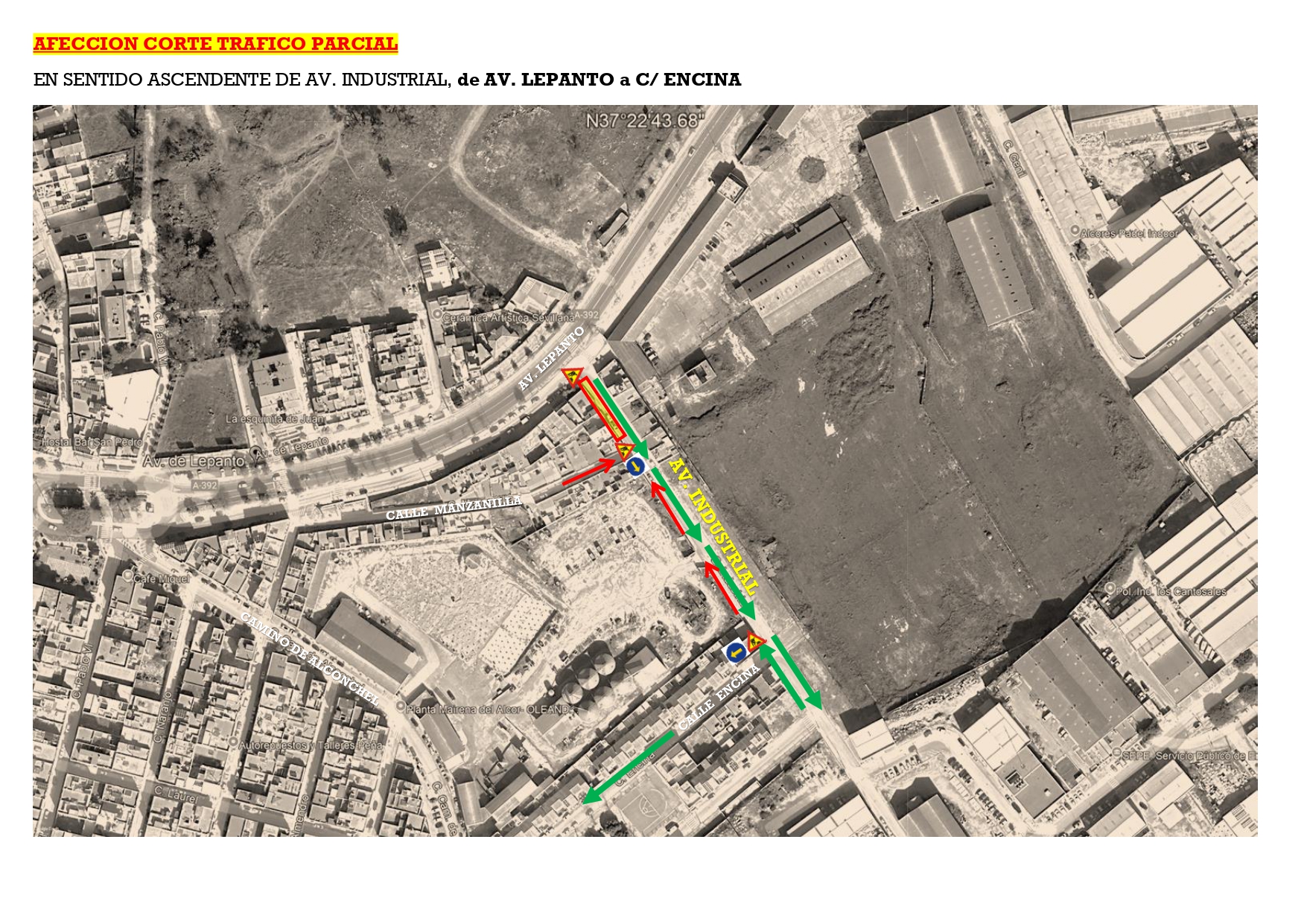 La Policía Local de Mairena del Alcor informa del corte parcial al tráfico rodado en la calle Industrial, necesario para descubrir la acometida de abastecimiento de Emasesa que discurre por la calzada entre la avenida Lepanto y la calle Encina.