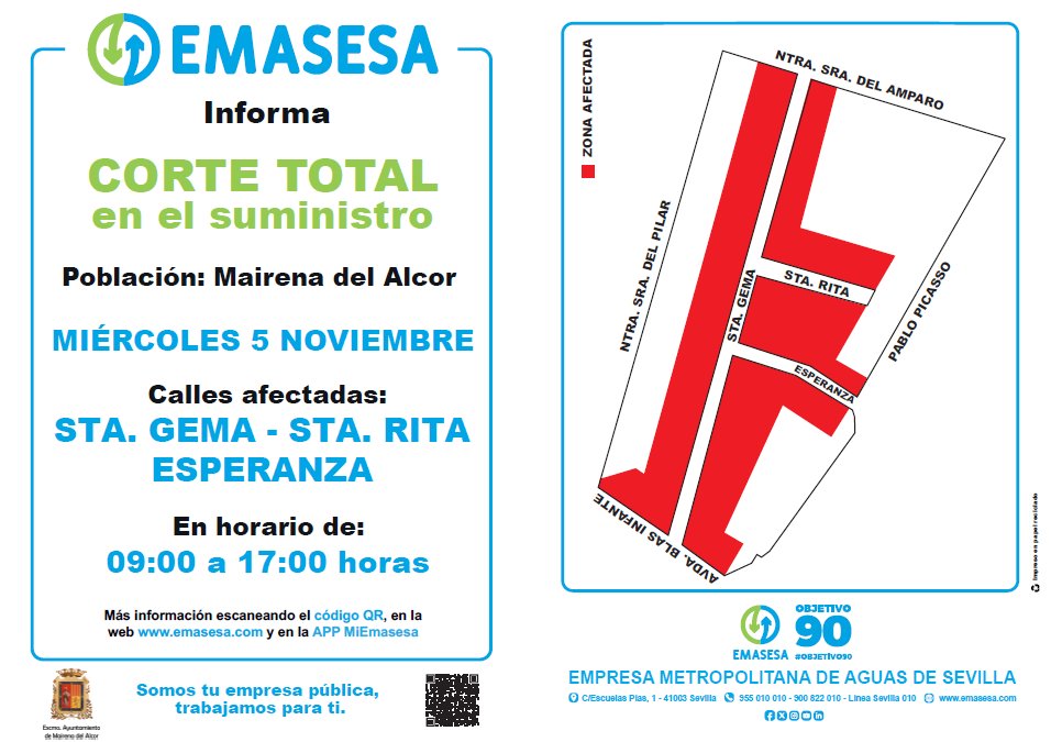 Emasesa Metropolitana informa que el miércoles 5 de noviembre se producirán cortes totales en el suministro de agua en las calles Santa Gema, Santa Rita y Esperanza entre las 9:00 y 15:00 horas.