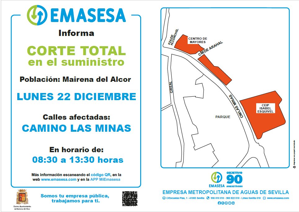 Emasesa Metropolitana informa que el lunes 22 de diciembre se producirán cortes totales en el suministro de agua en la calle Camino de las Minas entre las 8:30 y 13:30 horas.