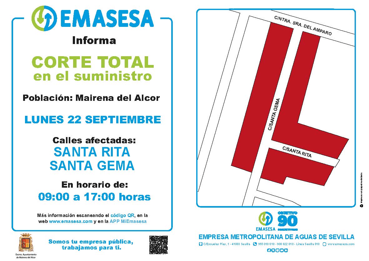 Emasesa Metropolitana informa que los días 22 y 23 de septiembre se producirán cortes totales en el suministro de agua en varias calles del barrio El Chorrillo, cada día entre las 9:00 y 17:00 horas.