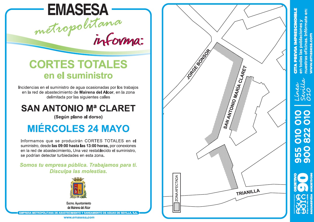 Emasesa Metropolitana informa que por trabajos en la red de abastecimiento, el miércoles 24 de mayo de 9.00 a 13.00 horas, se producirán cortes puntuales en el suministro de agua en la calle San Antonio Mª Claret.