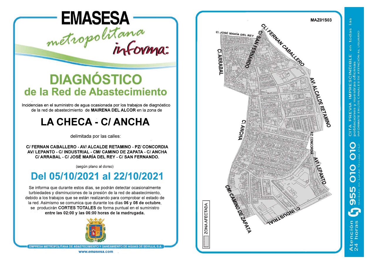 Emasesa Metropolitana informa que por trabajos en la red de abastecimiento, se producirán incidencias en el suministro de agua en las siguientes zonas: