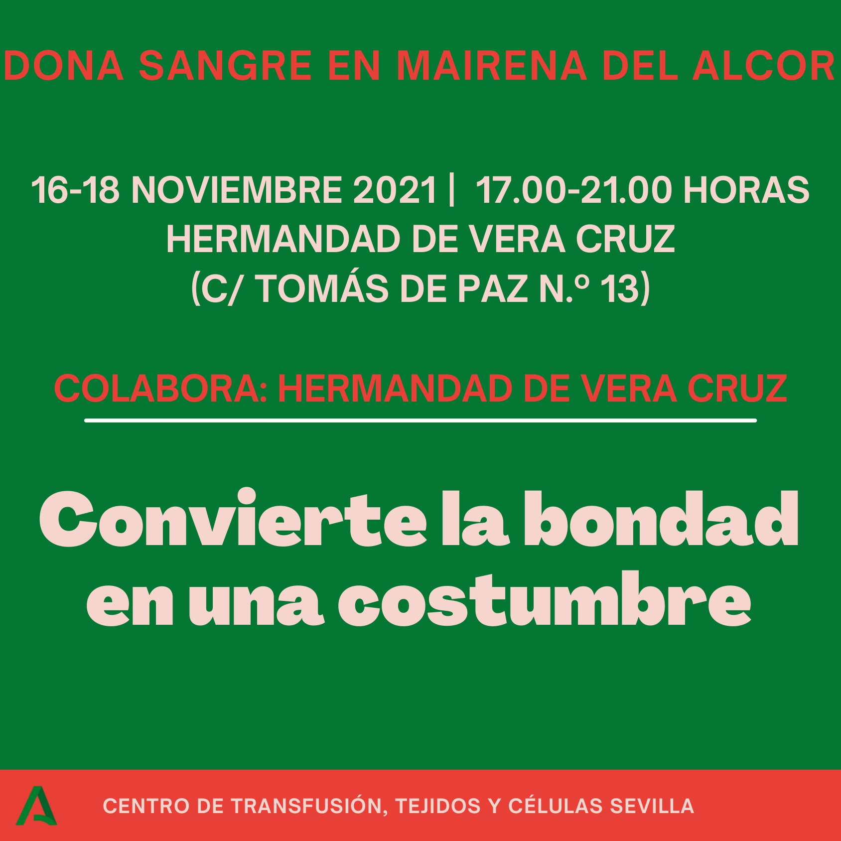 El Centro de Transfusión, Tejidos y Células de Sevilla organiza una nueva campaña de donación de sangre en la casa hermandad de la Vera+Cruz (calle Tomás de Paz, 13) los días 16, 17 y 18 de noviembre de 17.00 a 21.00 horas.
