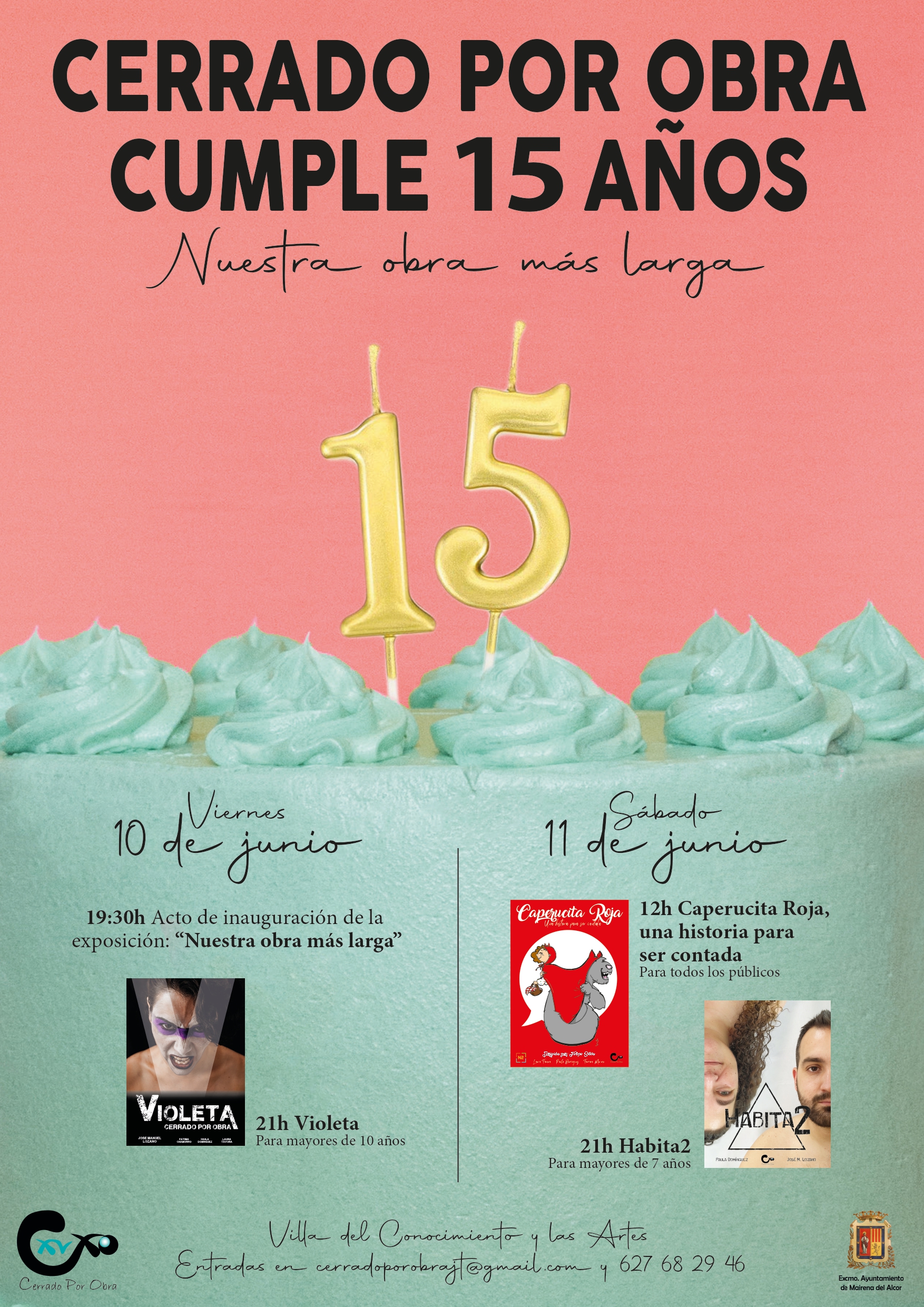 La Delegación de Cultura difunde el cartel del 15 aniversario de la Cía. de teatro Cerrado por Obra que celebrará, como no podía ser de otra manera, desplegando su faceta más artística de estos quince años de espectáculos. Será los días 10 y 11 de junio en la Villa del Conocimiento y las Artes.