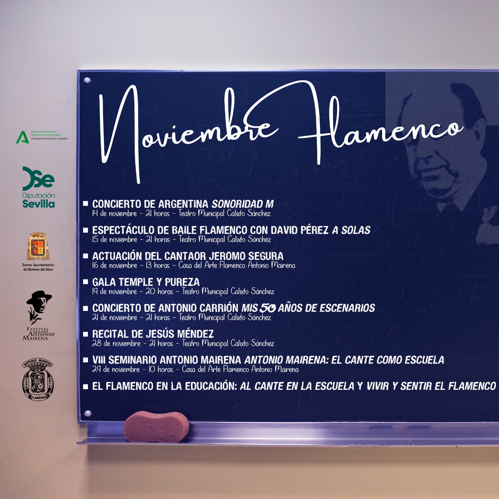 - Ramón Soler Díaz, acompañado por Bonela hijo al cante y Bonela chico a la guitarra, desarrollará “Antonio Mairena en los cantes derivados del fandango”, profundizando en un repertorio menos conocido pero esencial para comprender la amplitud del maestro de los Alcores.