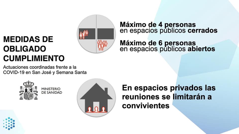 - Las reuniones sociales se limiten a 6 personas en exteriores, y 4 en interiores. Estas restricciones se harán efectivas también para el puente de San José o del día del padre, entre el 17 y el 21 de mayo.