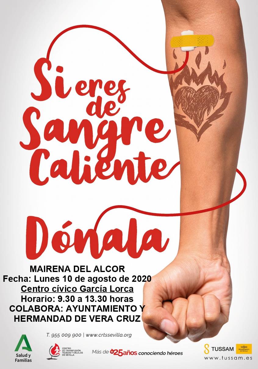 El Centro de Transfusión Sanguínea de Sevilla organiza una nueva campaña de donación de sangre, el lunes 10 de agosto de 9.30 a 13.30 horas en el Centro Cívico Federico García Lorca (C/ Pinar, 29).