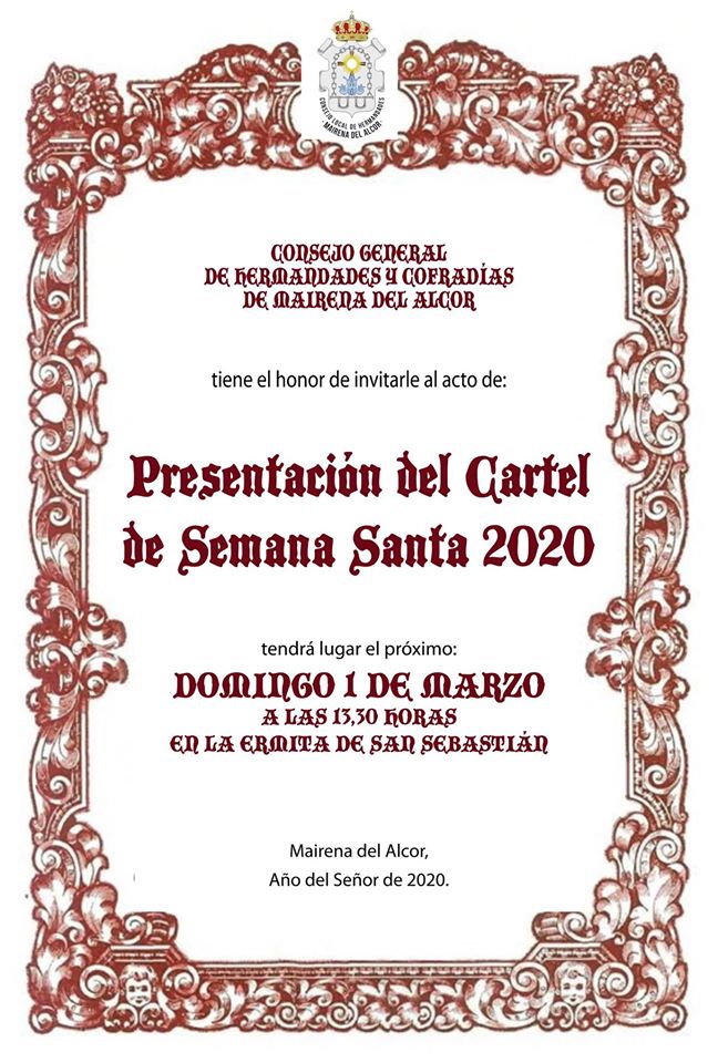 El Consejo General de Hermandades y Cofradías de Mairena del Alcor ha fijado la presentación del cartel de la Semana Santa 2020 para el domingo día 1 de marzo a las 13.30 horas en la Ermita San Sebastián. Este año ilustrará el cartel una imagen de la Hermandad de Jesús Nazareno. Se trata de una obra fotográfica de Mary Guillén, cuyo estilo reside en tratar cada trabajo de forma particular, personal y desde una perspectiva basada en el respeto.