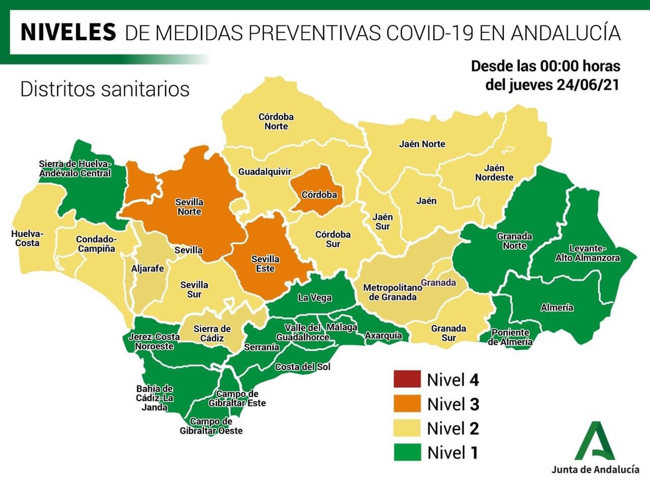 Mientras el distrito sanitario Aljarafe, Sevilla y Sevilla Sur se encuentran en nivel de alerta sanitaria 2 (riesgo medio). Cabe destacar que estos niveles de alerta decretados marcan horarios y aforos de las actividades en cada localidad.