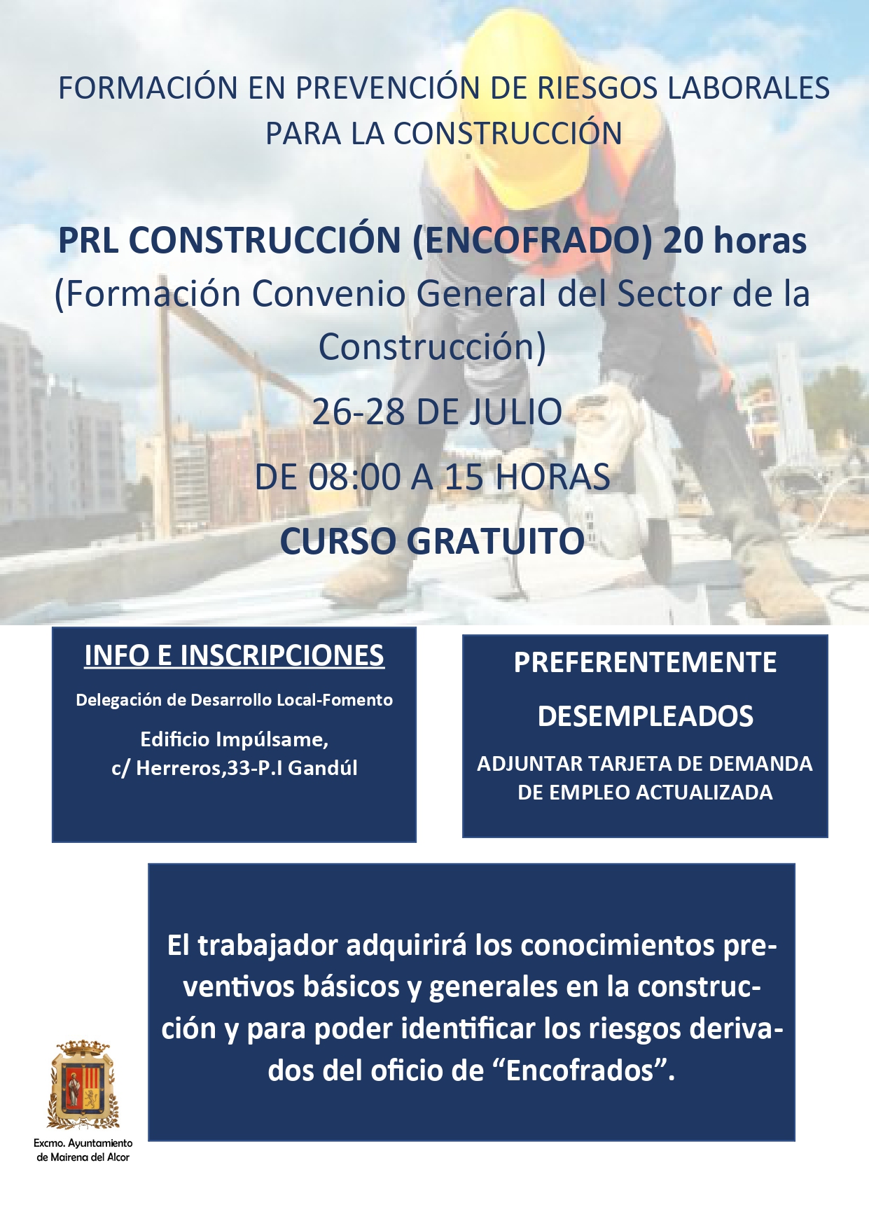 El delegado municipal de Formación, Santiago Mauri, anima a todas las personas que se dedican a la construcción, a participar en un curso gratuito dirigido a los profesionales del sector “sigue abierto el plazo de inscripción del curso prevención de riesgos laborales en la construcción para trabajos de encofrado. Este curso que consta de 20 horas, se impartirá entre los días 26 al 28 de julio, en horario de 8 a 15 horas en el Edificio Impúlsame”.