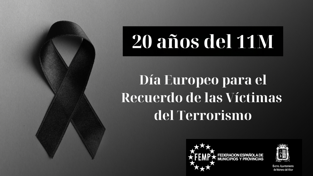 El Ayuntamiento de Mairena del Alcor convoca un minuto de silencio el lunes 11 de marzo a las 12 horas en la plaza Antonio Mairena, con motivo del Día Europeo en Memoria de las Víctimas del Terrorismo, al cumplirse 20 años desde los terribles atentados que costaron la vida a 193 personas en Madrid. Por este motivo, y en memoria de los fallecidos en aquellos dramáticos sucesos y sus familias, la Federación Español de Municipios y Provincias ha instado a las administraciones locales y provinciales a convocar el minuto de silencio.
