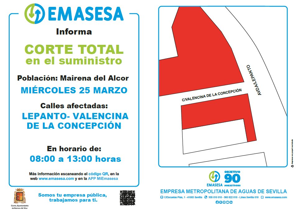 Emasesa Metropolitana informa que el miércoles 25 de marzo se producirán cortes totales en el suministro de agua en las calles Lepanto y Valencina de la Concepción entre las 8:00 y 13:00 horas.