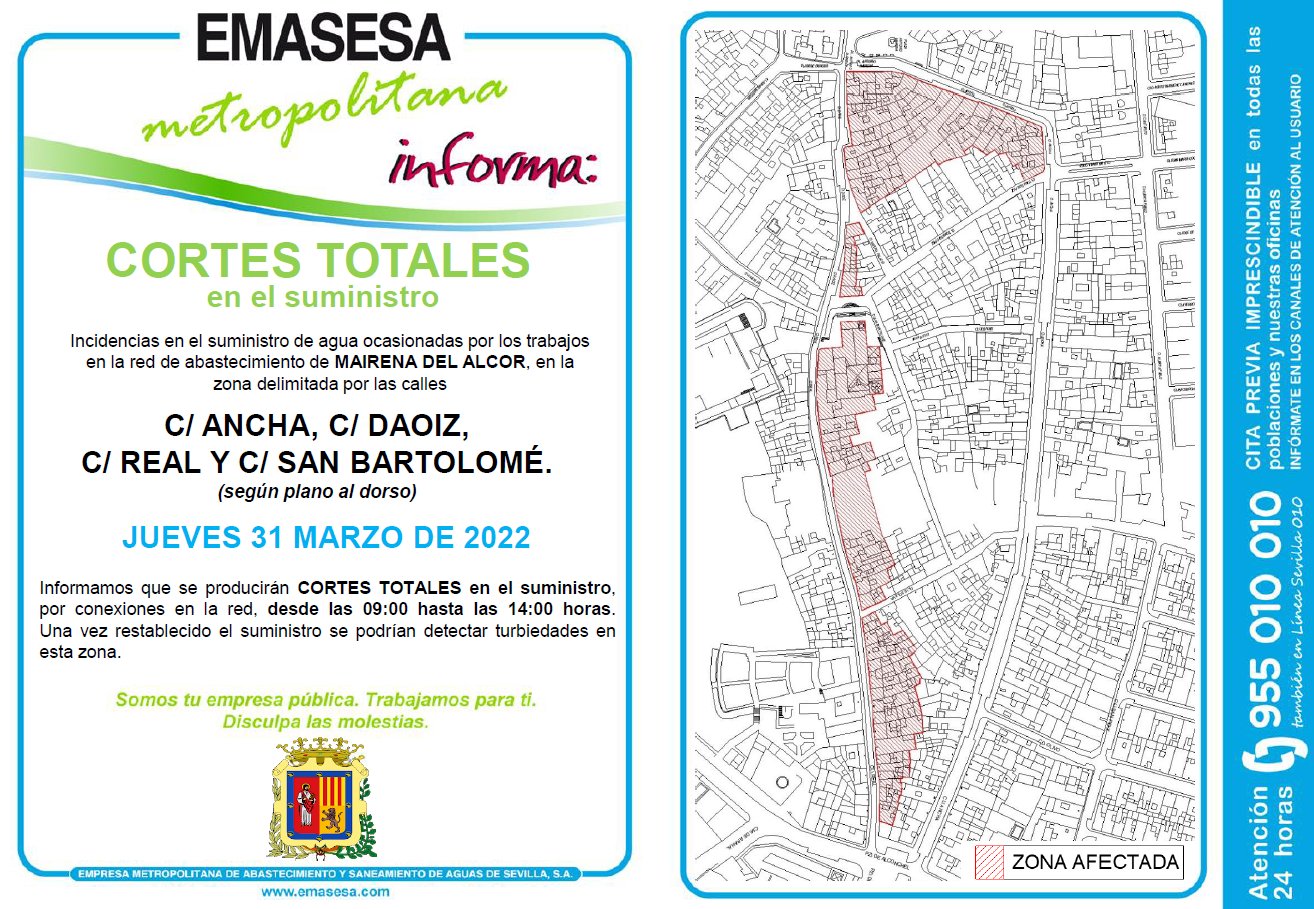 Emasesa Metropolitana informa que por trabajos en la red de abastecimiento, el jueves 31 de marzo de 9 a 14 horas, se producirán cortes puntuales en el suministro de agua, en la zona comprendida por las calles Ancha, Daoiz, Real y San Bartolomé.