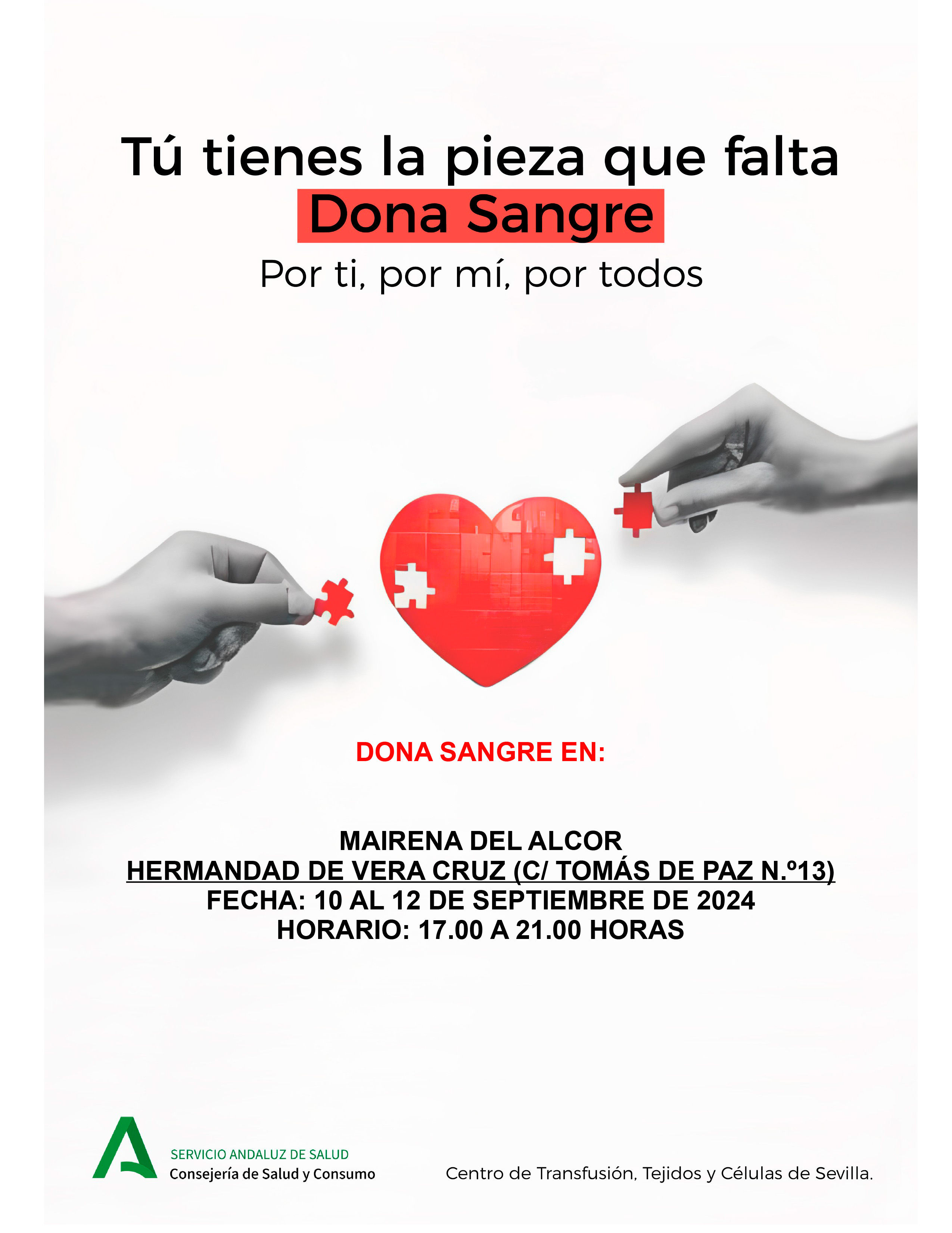 El Centro de Transfusión, Tejidos y Células de Sevilla organiza una nueva campaña de donación de sangre en la casa hermandad de la Vera+Cruz (C/ Tomás de Paz, 13) los días 10, 11 y 12 de septiembre de 17 a 21 horas.