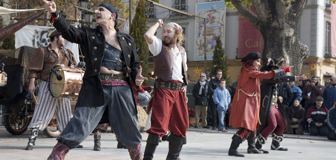 Este espectáculo de animación familiar y teatro de calle, persigue la ambientación pirata a través de la música, el juego colectivo y la interacción con el público. Acróbatas, brujas voladoras, náufragos, islas encantadas y dragones de fuego transformarán la céntrica plaza en un ancho mar, donde un viejo barco pirata conducirá hasta el tesoro.