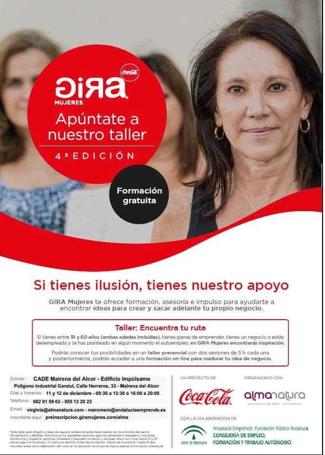 Coca-Cola invita a participar a las vecinas en el proyecto GIRA Mujeres, en colaboración con el CADE de Mairena del Alcor y el Ayuntamiento de Mairena del Alcor, con el objetivo de favorecer el empoderamiento de la mujer en la toma de decisiones en su ámbito profesional y personal mediante el impulso de sus proyectos e iniciativas laborales.