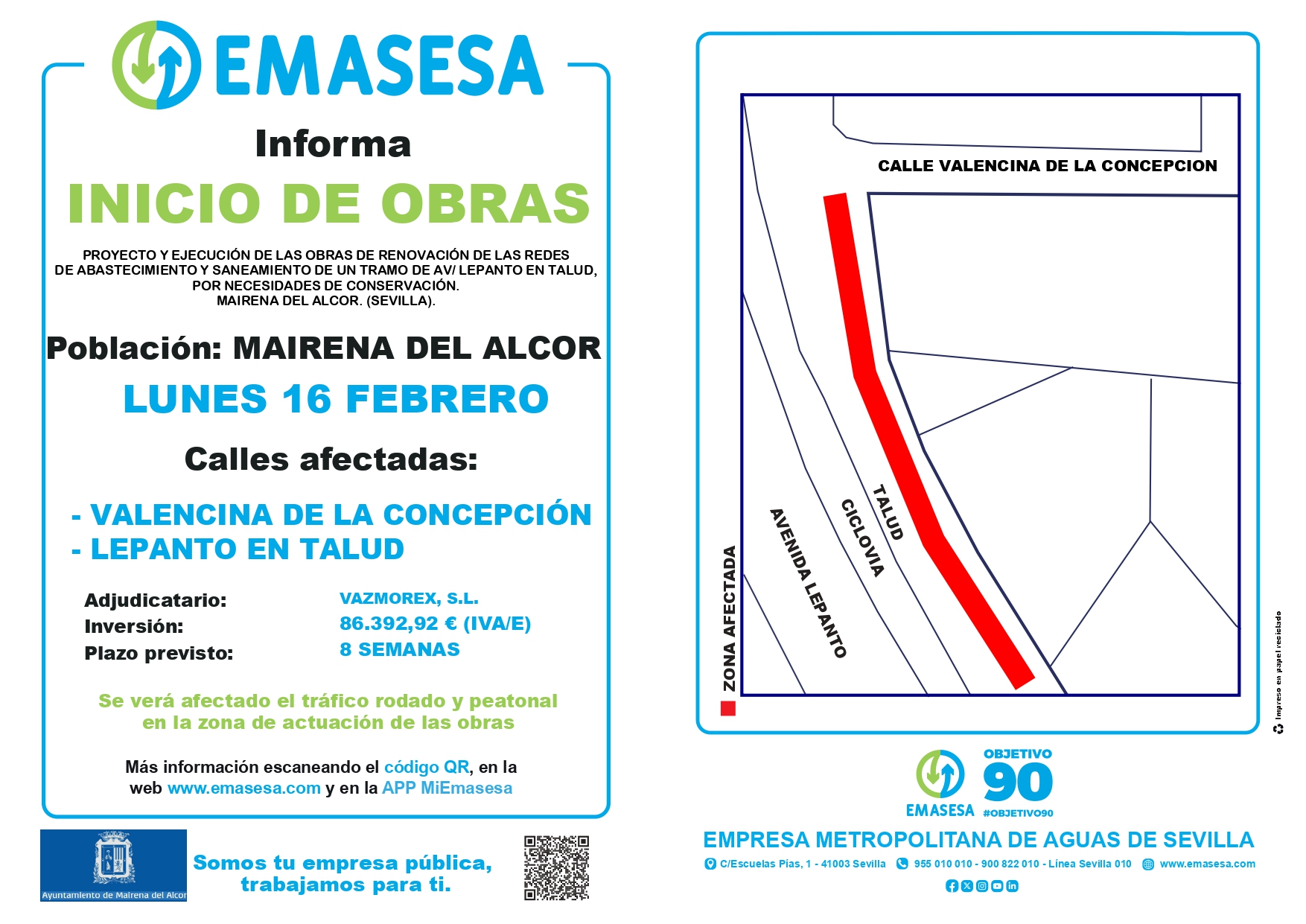 En la avenida de Lepanto y la calle Valencina de la Concepción se verá afectado el tráfico rodado y peatonal debido a la obra de renovación de las redes de abastecimiento y saneamiento que Emasesa comenzará a ejecutar el lunes 16 de febrero. La empresa adjudicataria de los trabajos es Vazmorex SL, tendrán una duración de 8 semanas y un presupuesto de 86.392,92 euros.