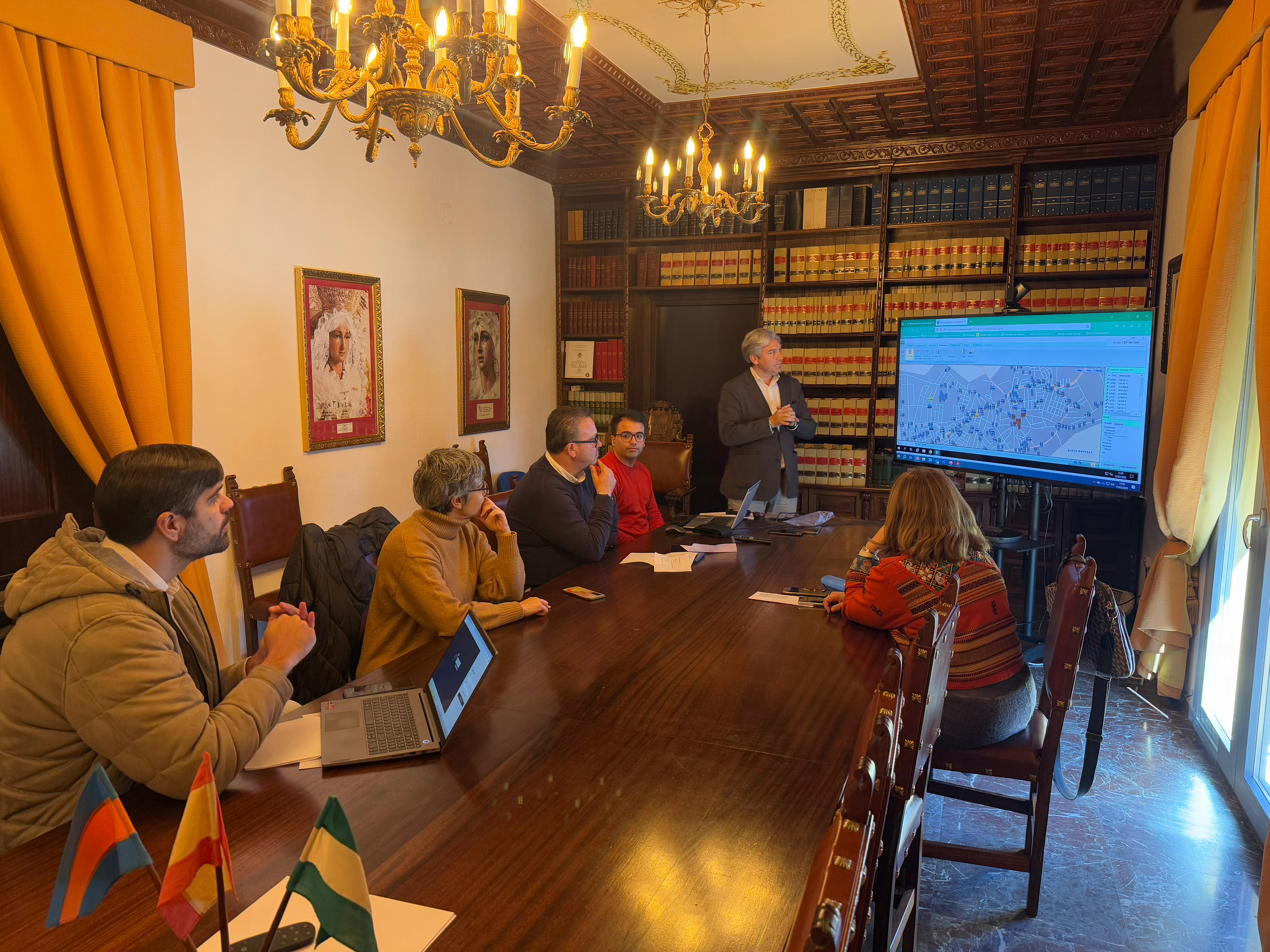 Los concejales de Digitalización Urbana y Coordinación de Barrios, Santiago Mauri y José Romero, junto a personal del Ayuntamiento han asistido a la presentación de la herramienta de gestión del servicio de limpieza urbana, a cargo de Carlos Mora, delegado Territorial de Andalucía y Extremadura de la empresa Paprec, con la que quedarán registrados y georreferenciados todos los elementos que conforman el servicio de limpieza, papeleras, contenedores y maquinaria.
