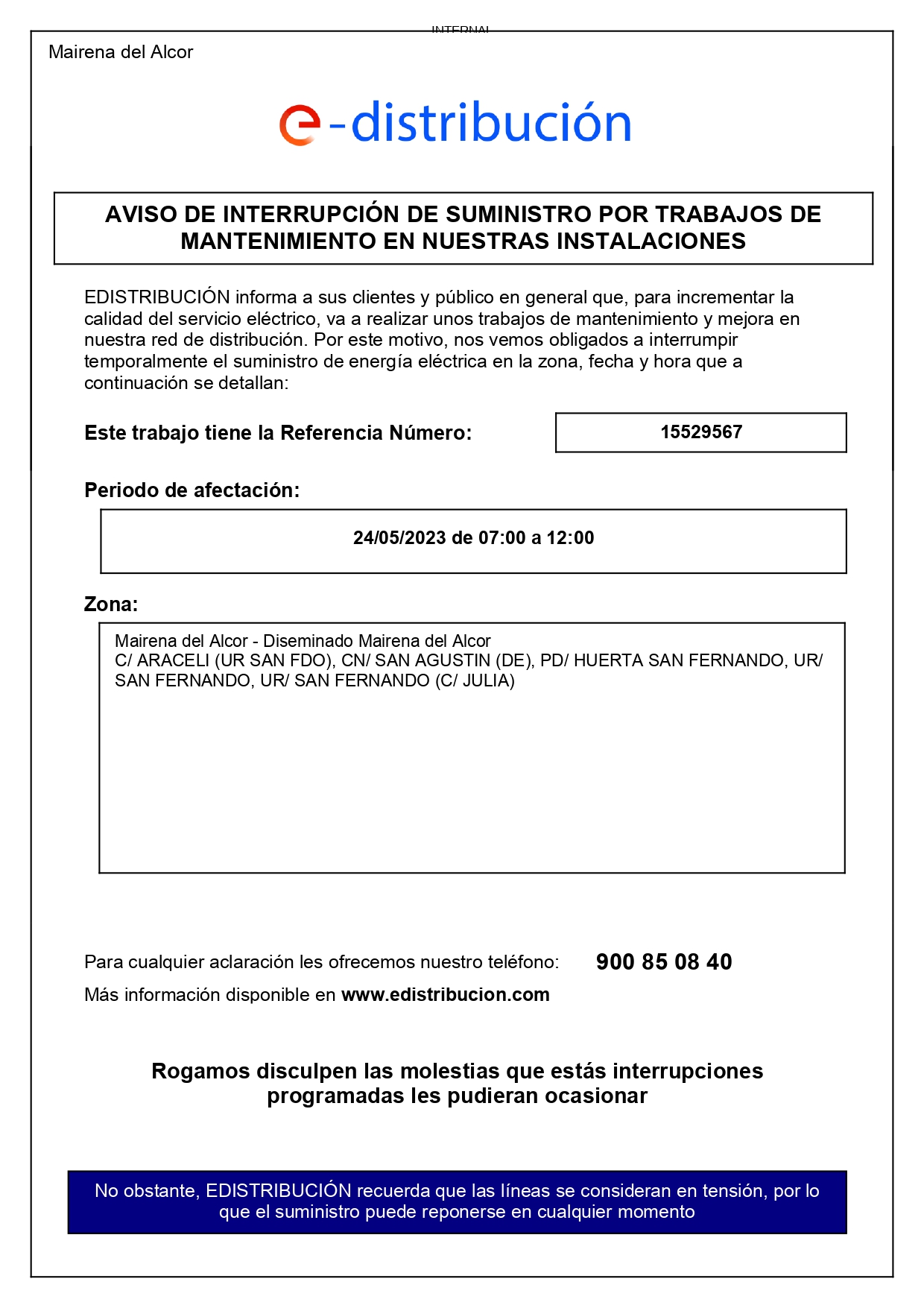 El Ayuntamiento de Mairena del Alcor difunde el comunicado de e-distribución informando que debido a la realización de unos trabajos de mantenimiento y mejora en las redes de distribución, la compañía se ve obligada a interrumpir el suministro de energía eléctrica el día 24 de mayo. El periodo de afectación será de 7 a 12 horas. Consulta la zona afectada en la imagen.