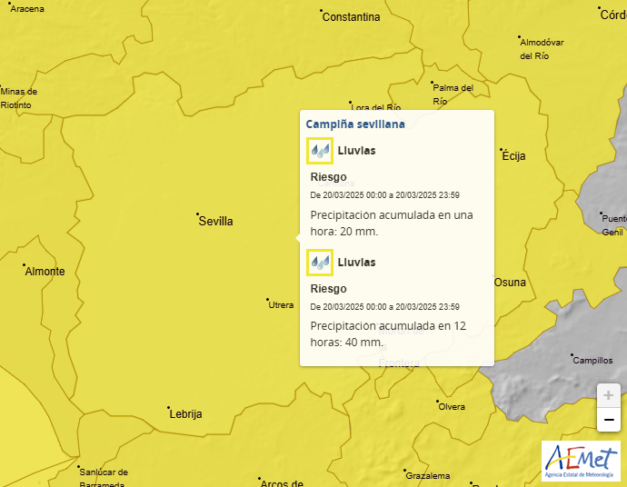 - Aviso amarillo por lluvias desde las 12 a las 23:59 horas. Valor: 40 mm en 12 horas