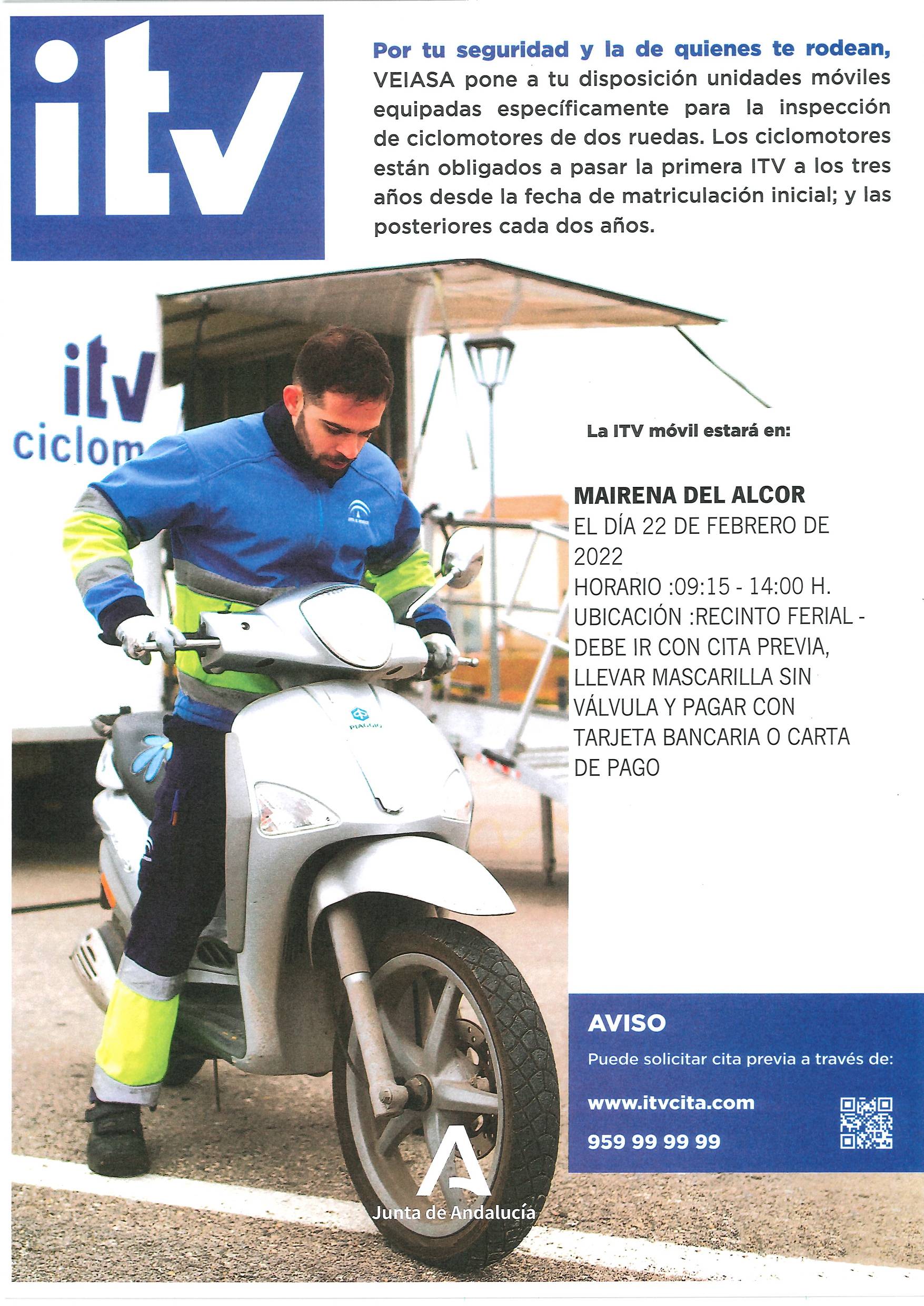 La Policía Local de Mairena del Alcor informa que los ciclomotores de dos ruedas están obligados a pasar la primera ITV a los tres años desde la fecha de matriculación inicial. Y a partir de ahí cada dos años.