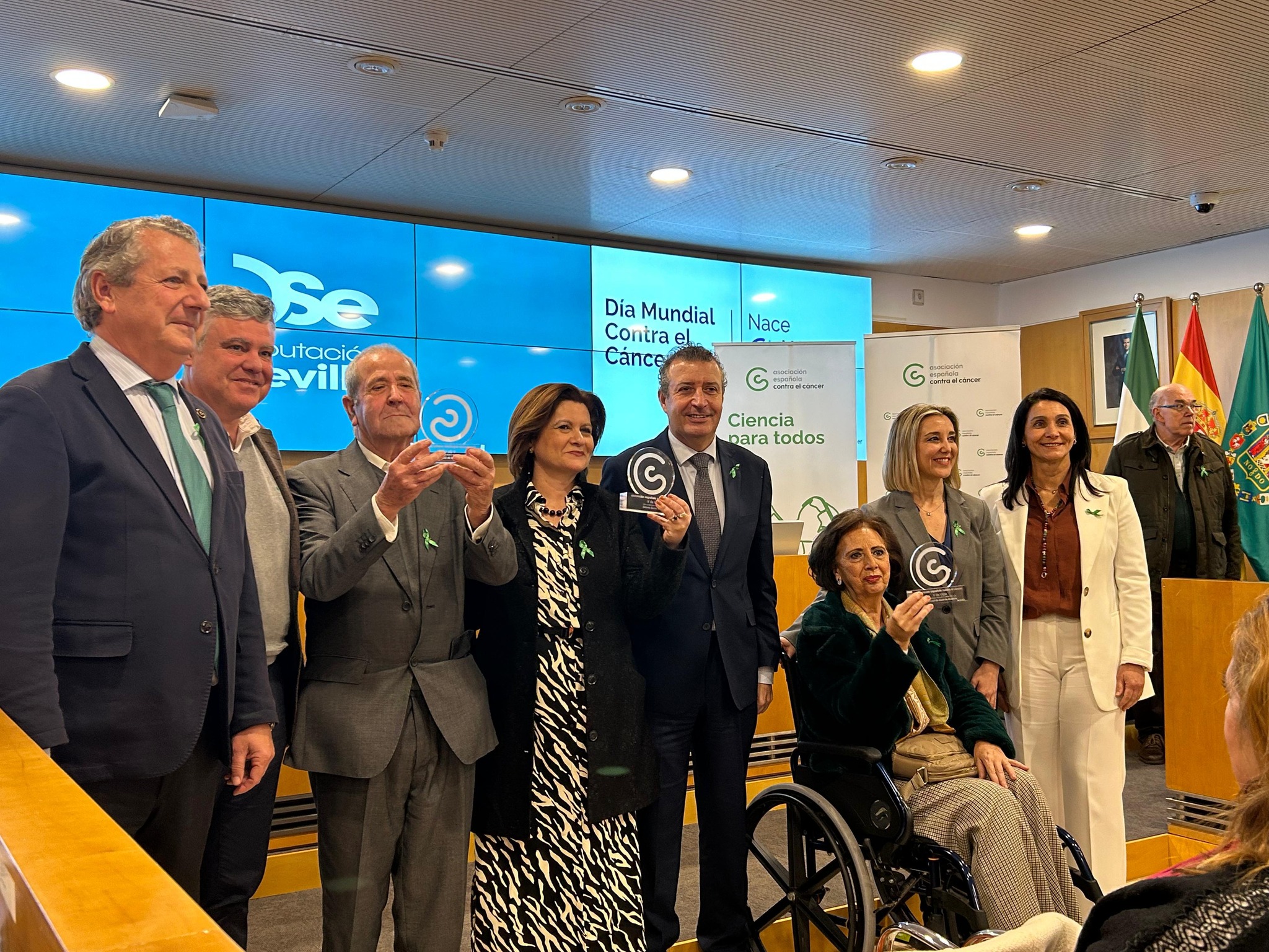 El alcalde, Juanma López Domínguez, la diputada Gloria Guillén y el concejal de Sanidad, Alejandro Cruz, han arropado a Loli Gavira el acto conmemorativo del Día Mundial contra el Cáncer que la delegación de Sevilla de la AECC organiza cada año en torno al 4 de febrero, y se ha celebrado hoy en la Diputación de Sevilla.