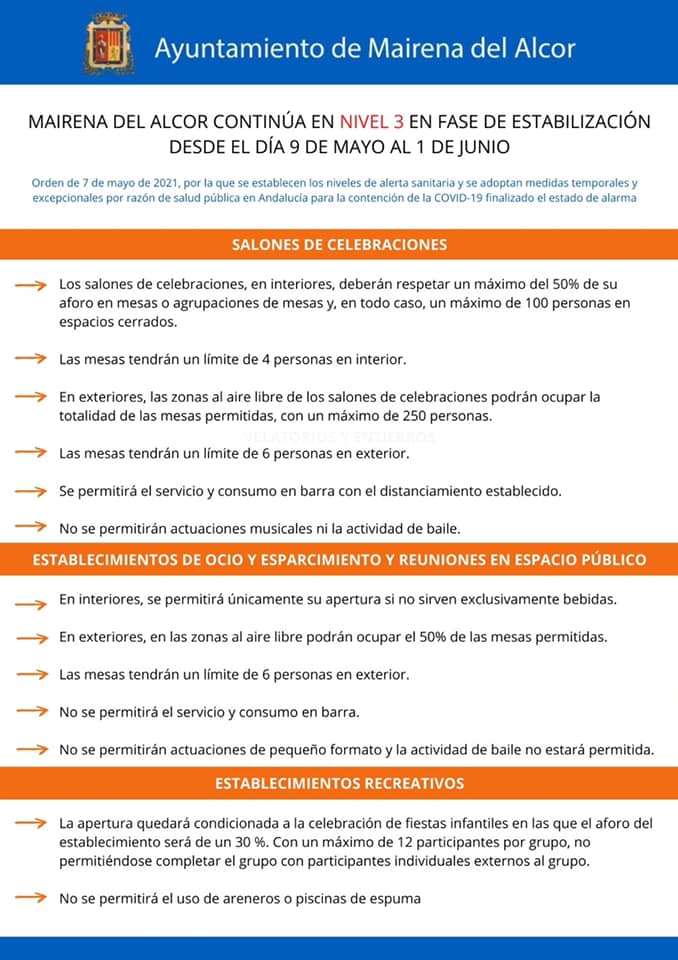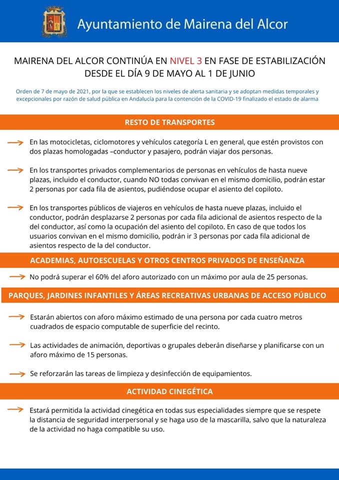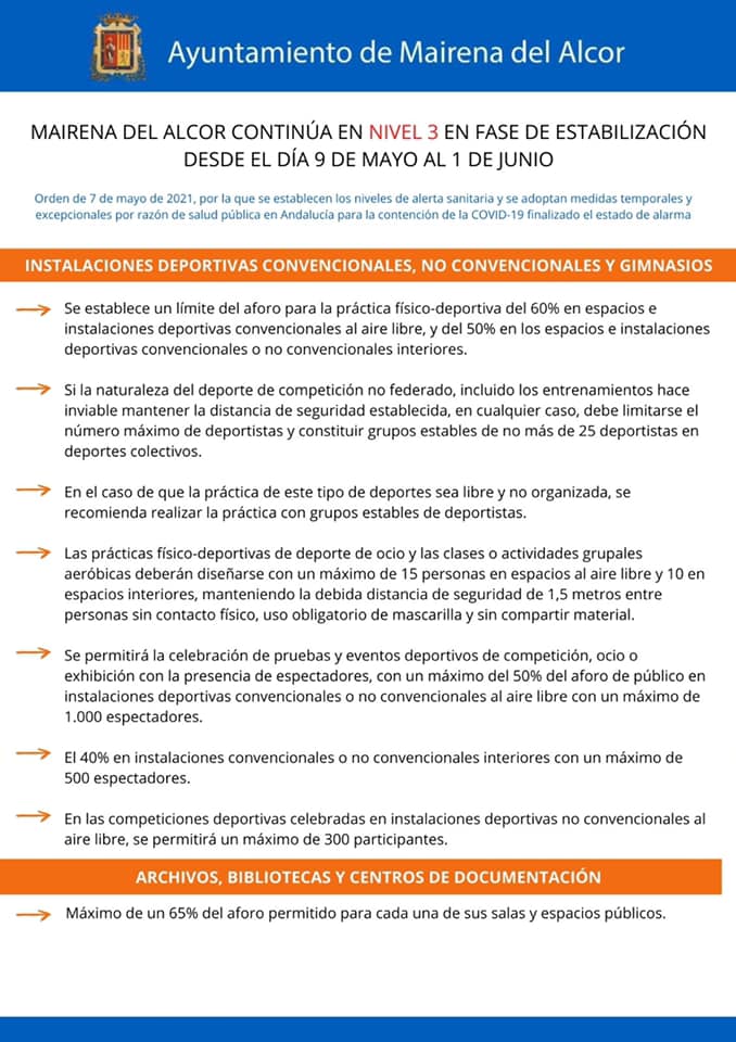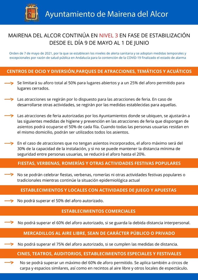 MAIRENA DEL ALCOR CONTINÚA EN NIVEL 3 EN FASE DE ESTABILIZACIÓN DESDE EL DÍA 9 DE MAYO AL 1 DE JUNIO