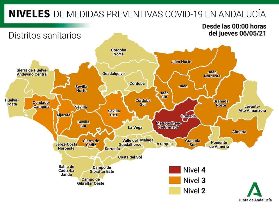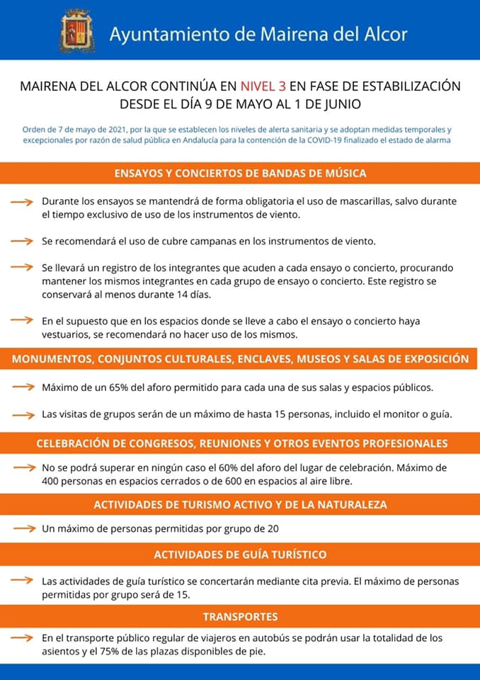 Nuevas medidas a cumplir en Mairena del Alcor del Alcor, según la Orden de 7 de mayo de 2021, por la que se establecen los niveles de alerta sanitaria y se adoptan medidas temporales y excepcionales por razón de salud pública en Andalucía para la contención de la COVID-19 finalizado el estado de alarma.