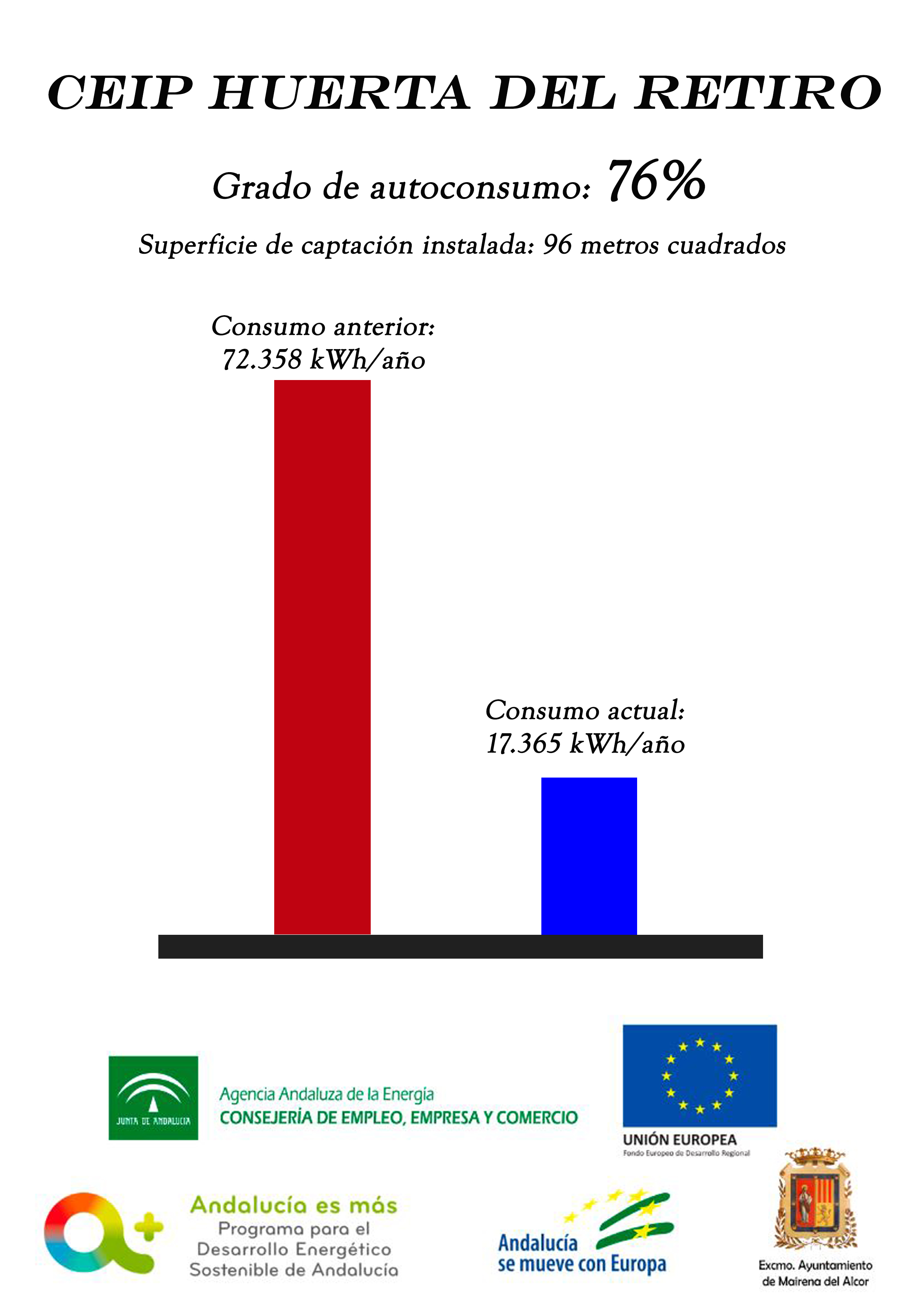 En cuanto a las instalaciones fotovoltaicas finalizadas en todos los colegios de la localidad, han supuesto una inversión total de 145.572,35 euros de los que 16.636,81 euros son de aportación municipal y el resto provienen de la Agencia Andaluza de la Energía financiada con Fondos FEDER.