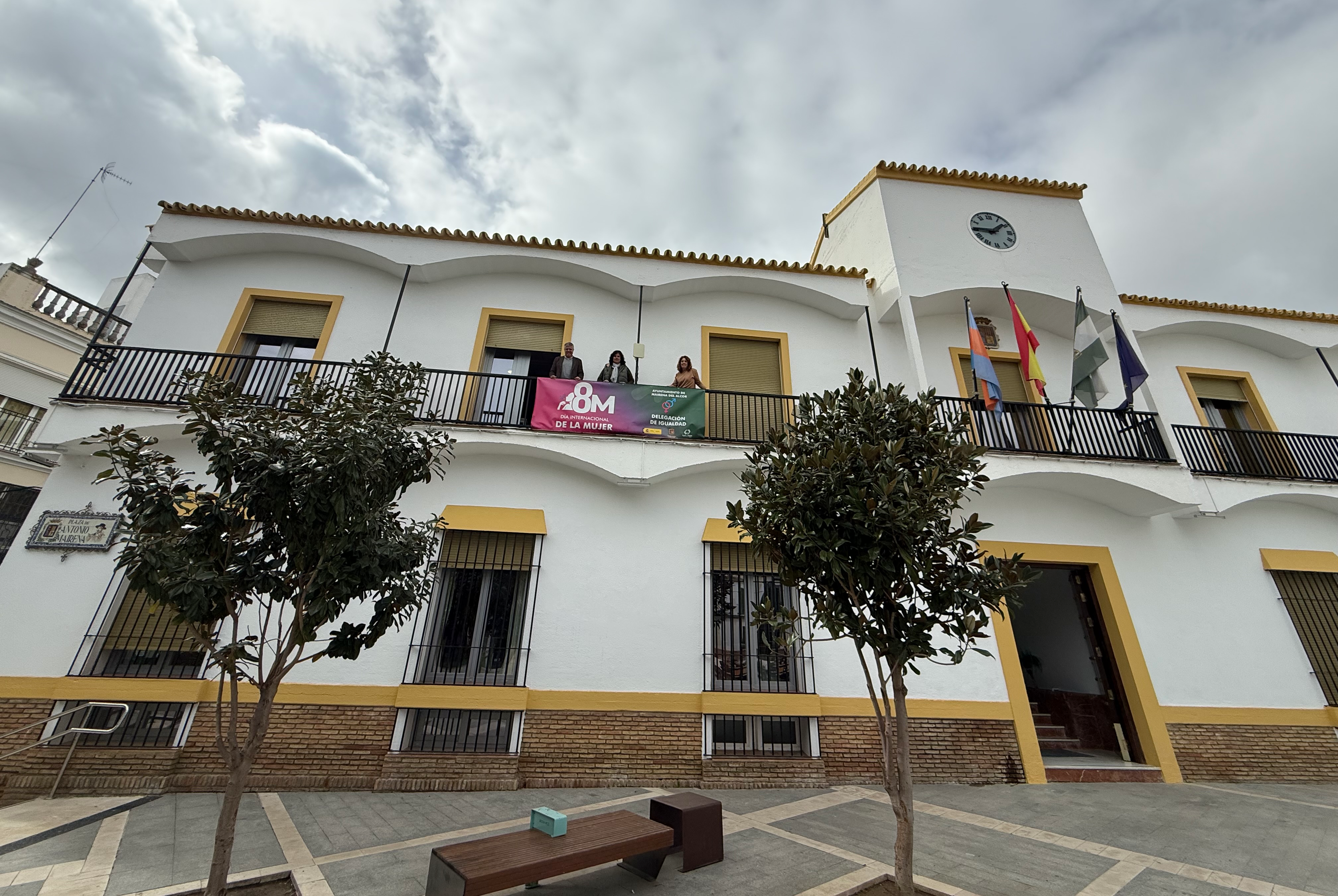 El alcalde, Juanma López, junto a técnicas de la Delegación de Igualdad han colocado la pancarta conmemorativa del 8M en el balcón del ayuntamiento.