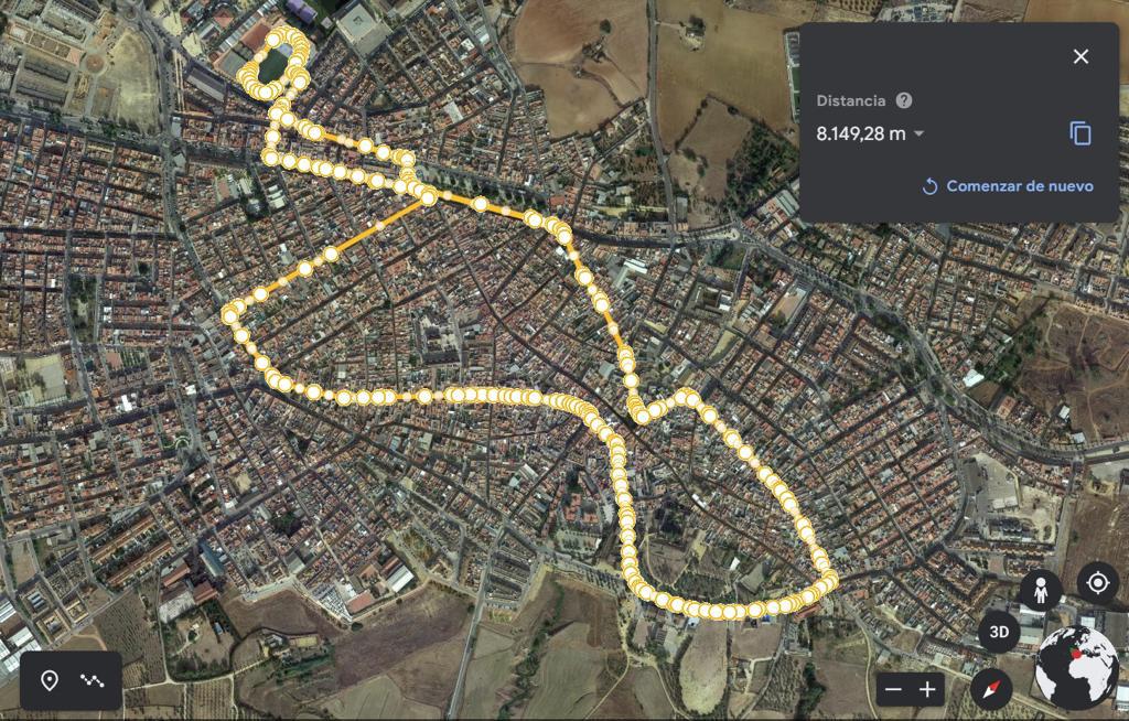El recorrido discurrirá por las calles Pedro Salinas, Pablo Nerura, glorieta Jiménez Sutil, avenida de Andalucía, San Fernando, plaza Antonio Mairena, Ancha, Alconchel, Camino de las Minas, Dolores Simó, Jorge Bonsor, Catalina González, Gandul, Arenal, Benajete, Ramón y Cajal, Cervantes y Jacinto Benavente. Llegados a este punto, los cadetes siguen recto hacia la meta en el polieportivo y los adultos continúan por Pedro Salinas para dar la segunda vuelta.