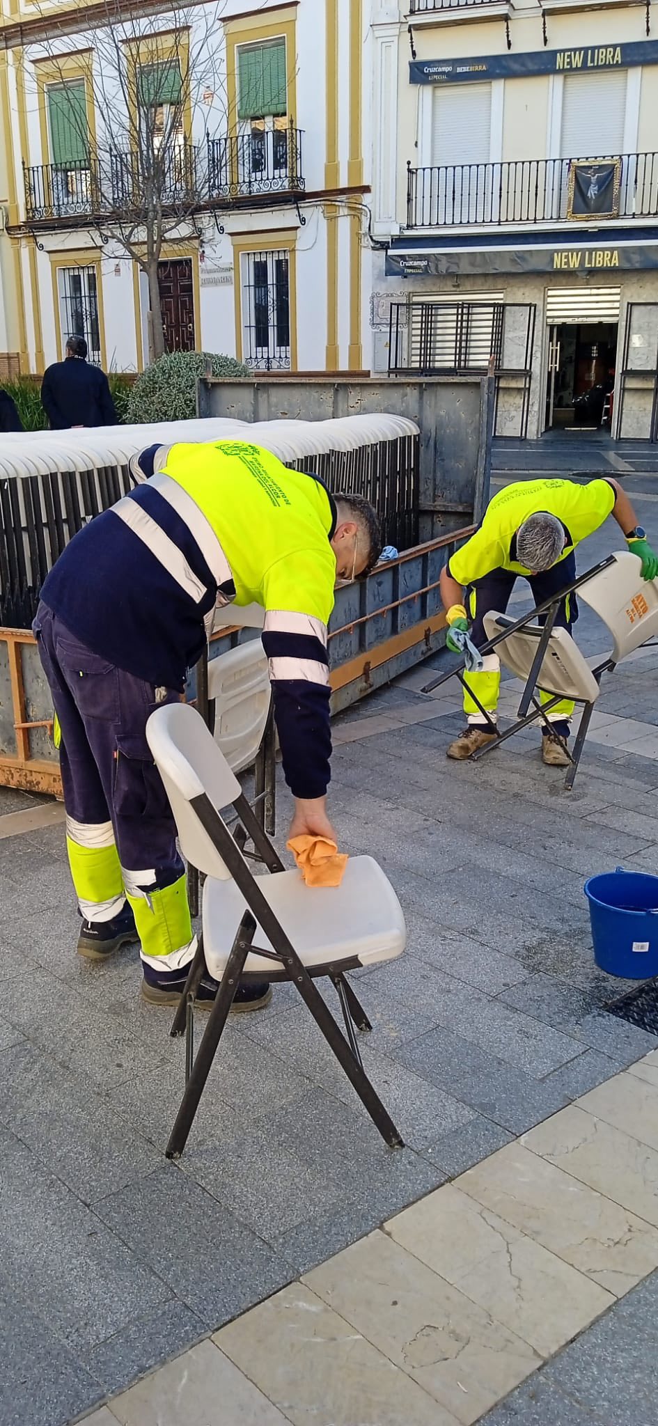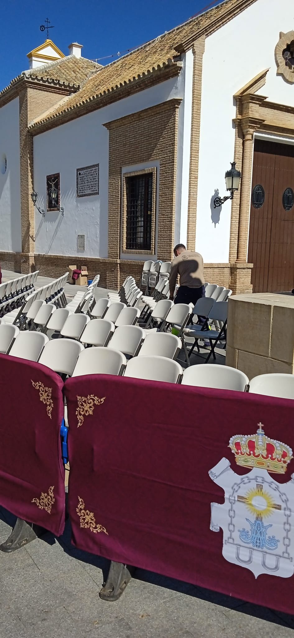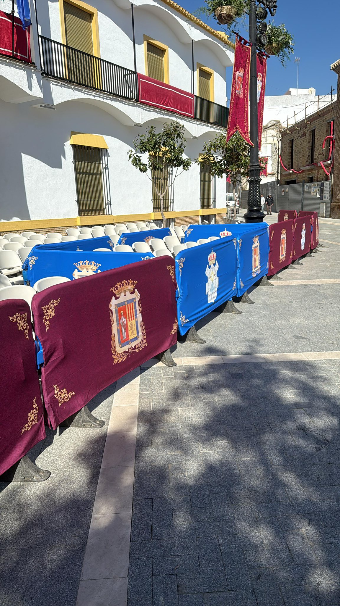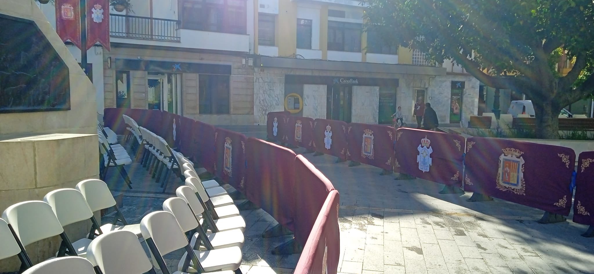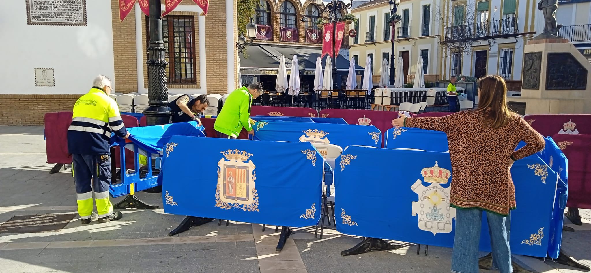 El concejal de Servicios, José Romero, la concejal de Festejos, Inmaculada Galocha, el presidente del Consejo de Hermandades y Cofradías, José Manuel Jiménez, y los operarios municipales han estado en el montaje de la carrera oficial donde se han colocado cerca de medio millar de sillas, más que otros años, totalmente gratuitas, y de manera preferente para personas mayores, mujeres embarazadas y personas con movilidad reducida.