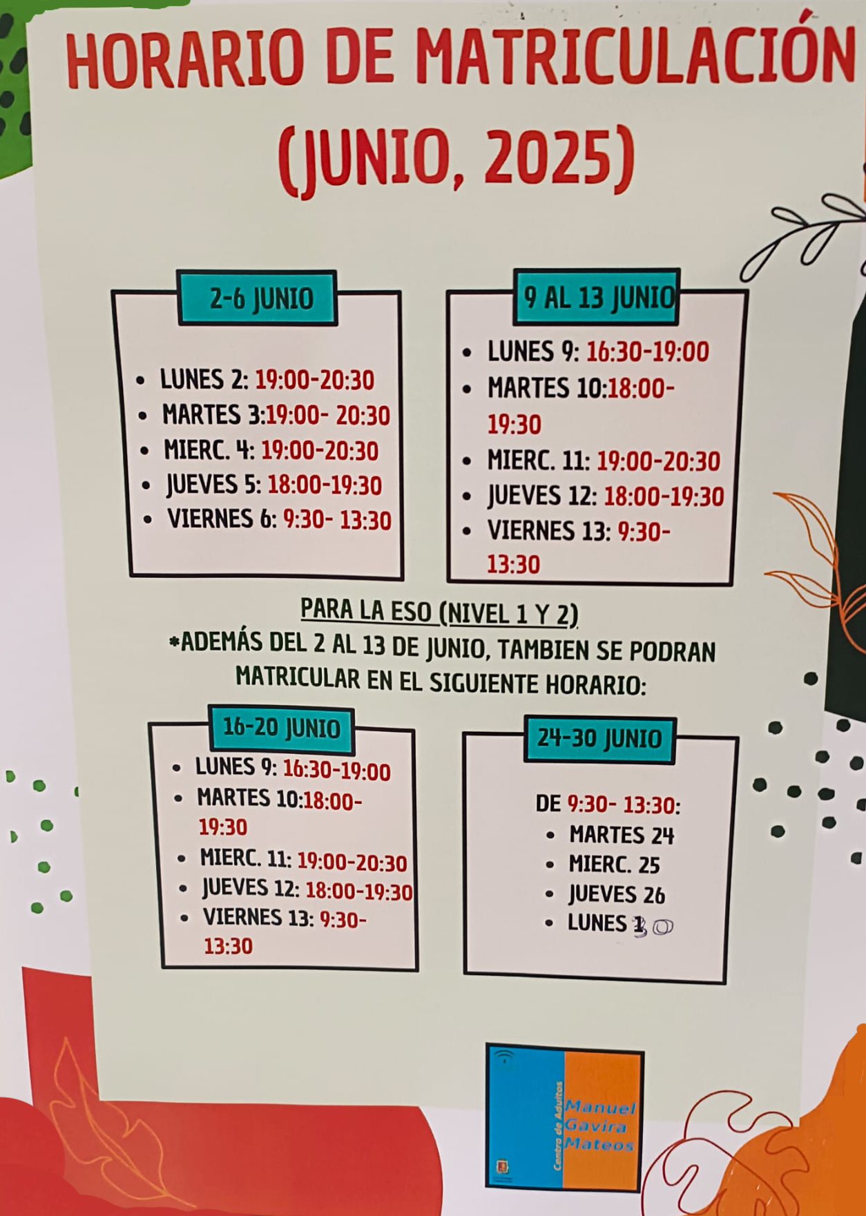 Matriculación para el curso 2025/26 del centro de adultos Manuel Gavira Mateos