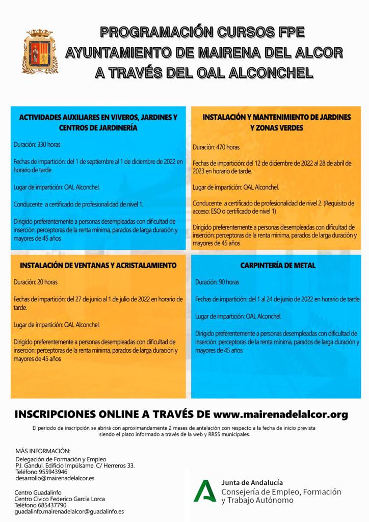 Mauri informa “a través del OAL Alconchel complementamos esta oferta con los cursos Actividades auxiliares en viveros, jardines y centros de jardinería de 330 horas entre los meses septiembre a diciembre. Instalación y mantenimiento de jardines y zonas verdes de 470 horas entre los meses de diciembre de 2022 a abril de 2023 e Instalación de ventanas y acristalamiento de 90 horas en junio”.